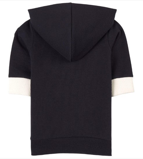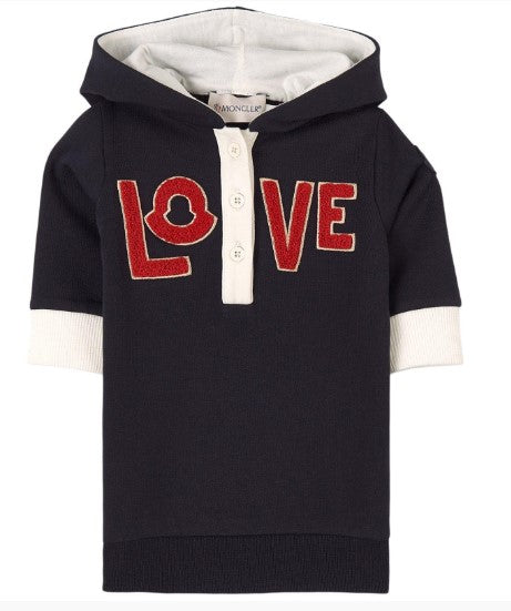 Sweatshirtkleid mit Kapuze und kontrastierendem Logo auf der Vorderseite.