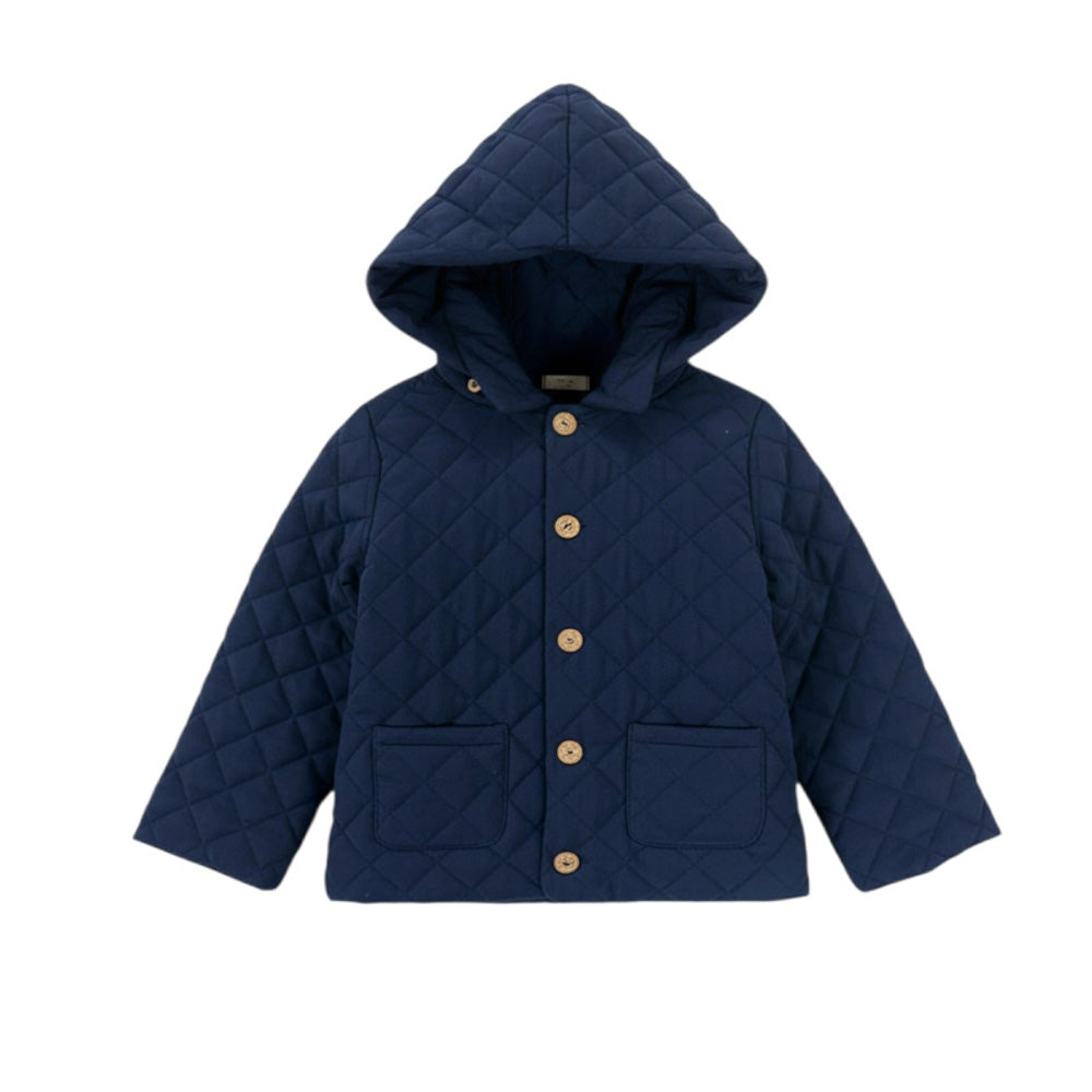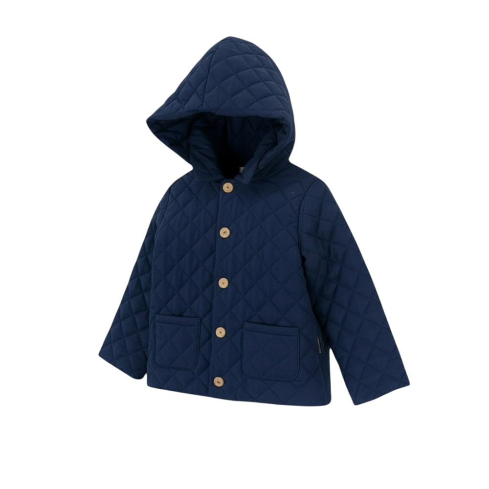 Diese Baby-Gi-Jacke besteht aus leichter Steppdecke aus 100 % Baumwolle und ist ideal, um Ihr Baby warm und bequem zu halten. Der Holzknopfverschluss sorgt für Stabilität und Sicherheit. Darüber hinaus machen die aufgesetzten Taschen und die abnehmbare Kapuze diese Jacke praktisch und funktional.