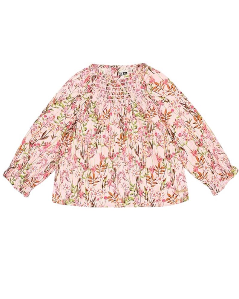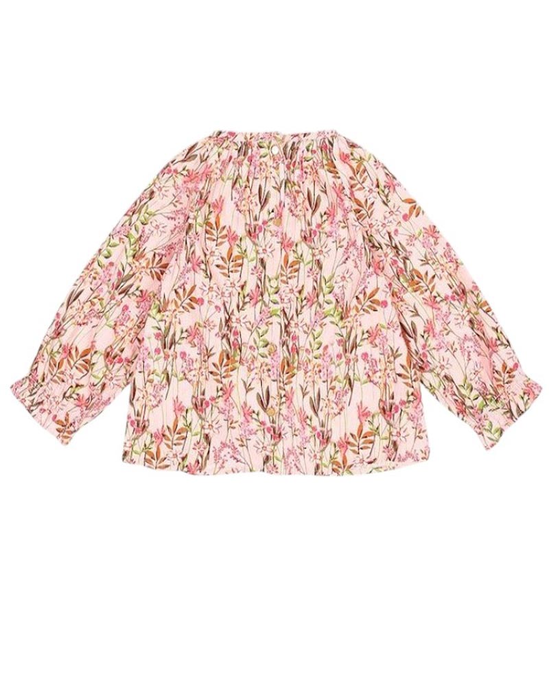 Camicia punto smock rosa da neonata realizzata in cotone. Presenta fantasia a fiori con dettagli lurex all-over, colletto tondo, maniche lunghe con polsini elasticizzati, chiusura posteriore con bottoncini a pressione e orlo svasato.