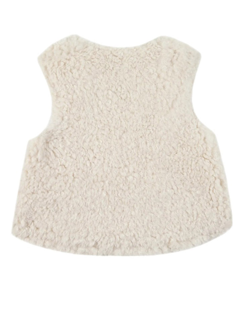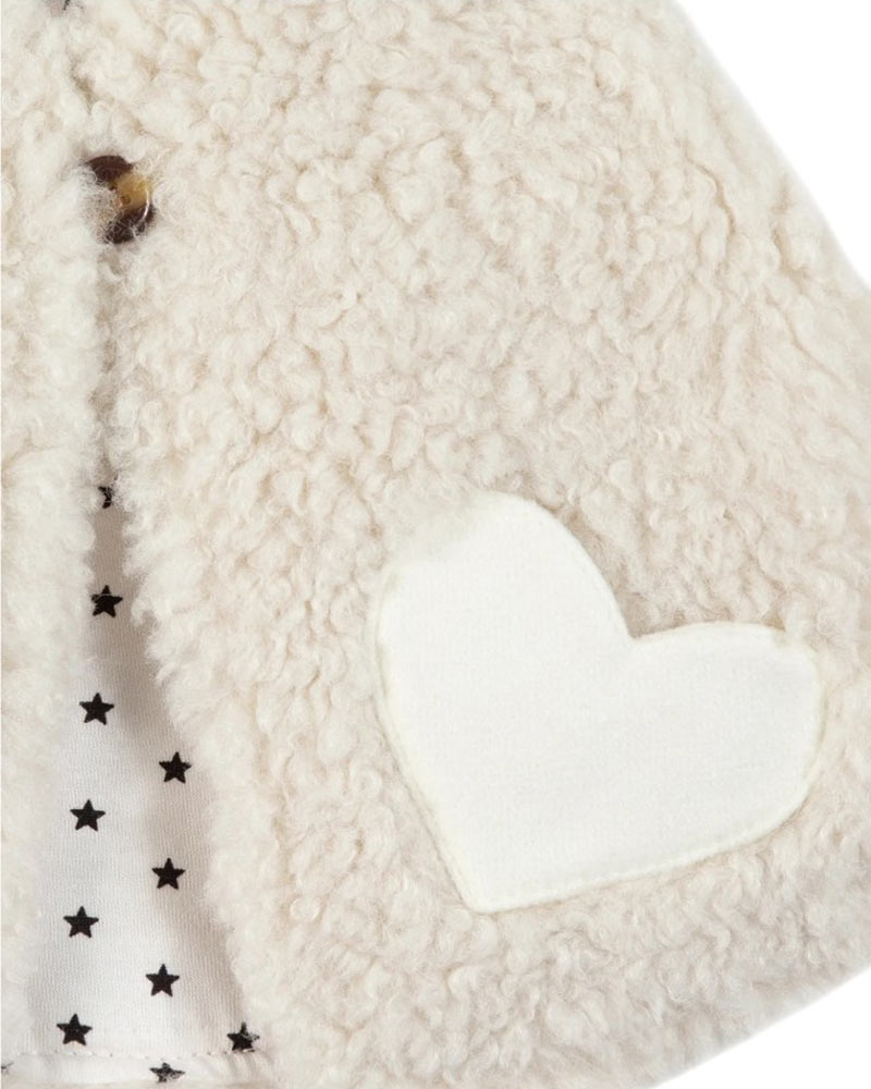 Gilet avorio da neonata realizzato in morbido tessuto teddy, caratterizzato da chiusura frontale con bottoncino, due tasche a forma di cuore applicate sul davanti e fodera in jersey di cotone.
