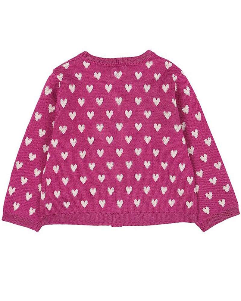 Cardigan da neonata realizzato in misto lana. Presenta fantasia a cuori all-over, collo tondo, maniche lunghe, chiusura frontale con bottoncini e finiture a coste.