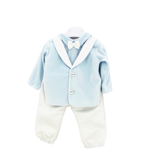 Zweiteiliger Strampler von Teto und Tatta mit Fake-Jacke und Fliege.
