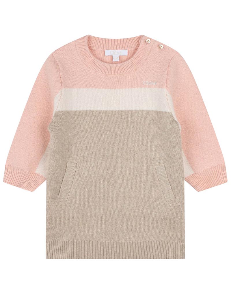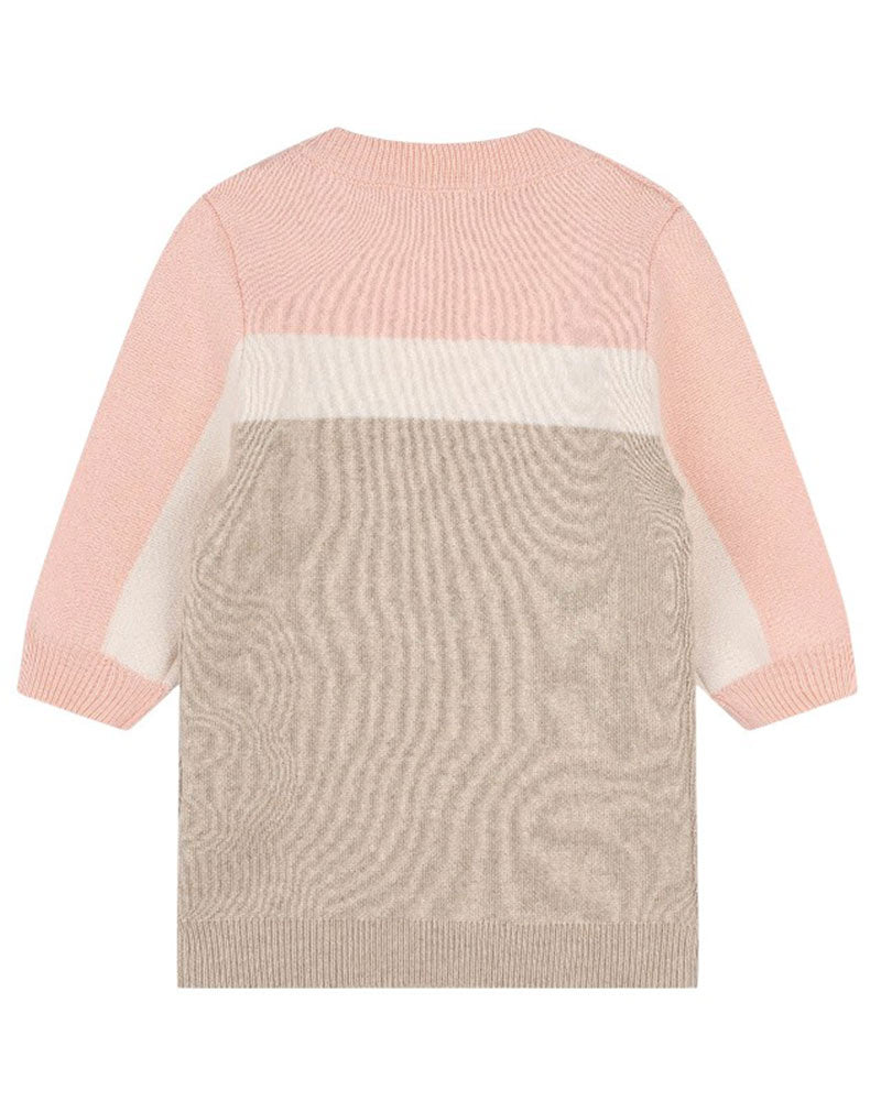 Vestina in maglia da neonata realizzata in misto cotone e lana. Presenta colletto tondo, maniche lunghe, tasca a marsupio sul davanti, chiusura con bottoncini sulla spallina e finiture a coste. È decorata con logo ricamato sul petto.