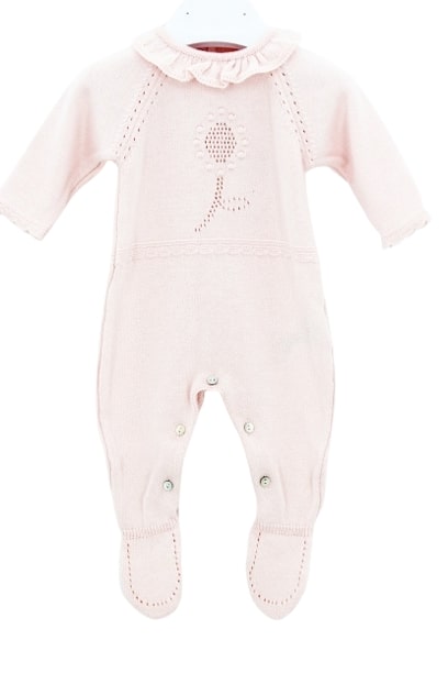 Modell mit Kragen mit Rüschen und Knöpfen auf der Rückseite und an der Innenseite der Beine.