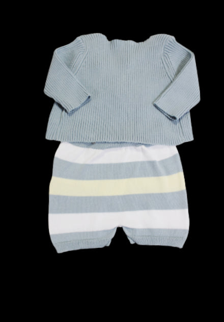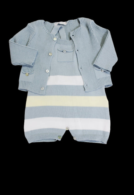 Overall von Doctor Kids aus Salbeigrün, Gelb und Weiß gestreiftem Garn mit passender Jacke.
