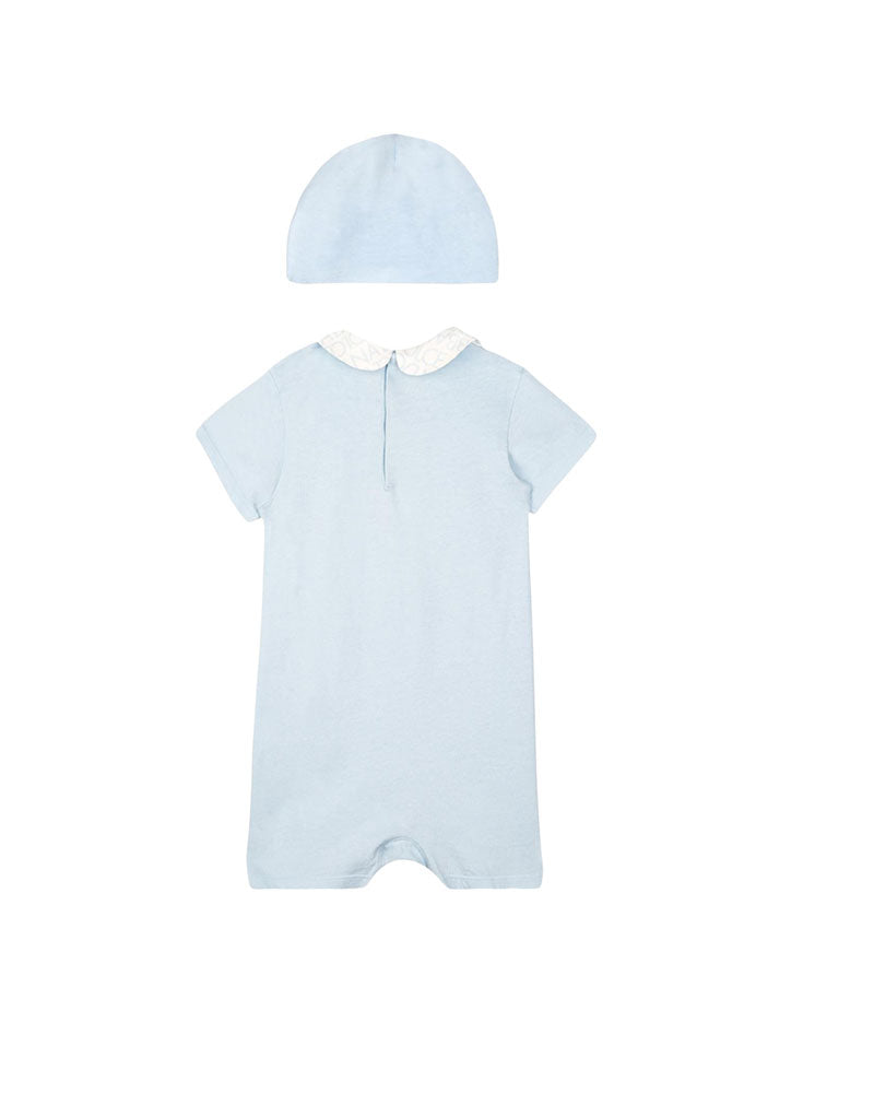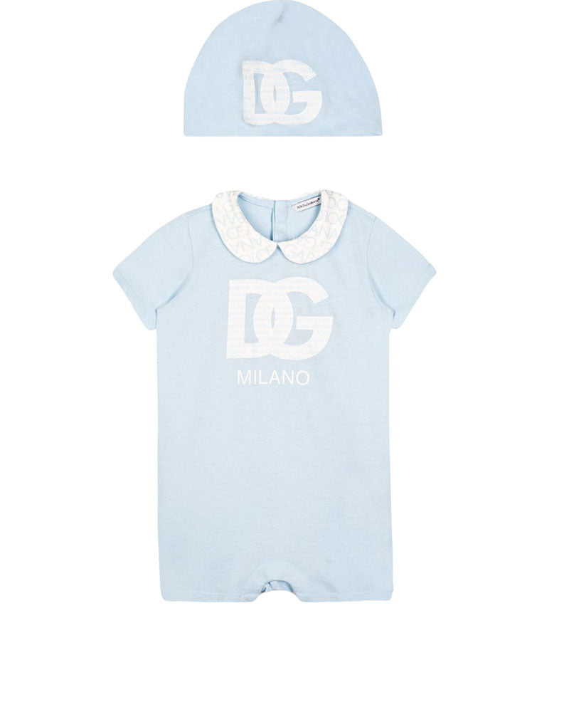 Set Dolce & Gabbana pagliaccetto + cappellino Scollo tondo maniche corte Stampa DG Milano Bottoni automatici nascosti al cavallo Made in Italy