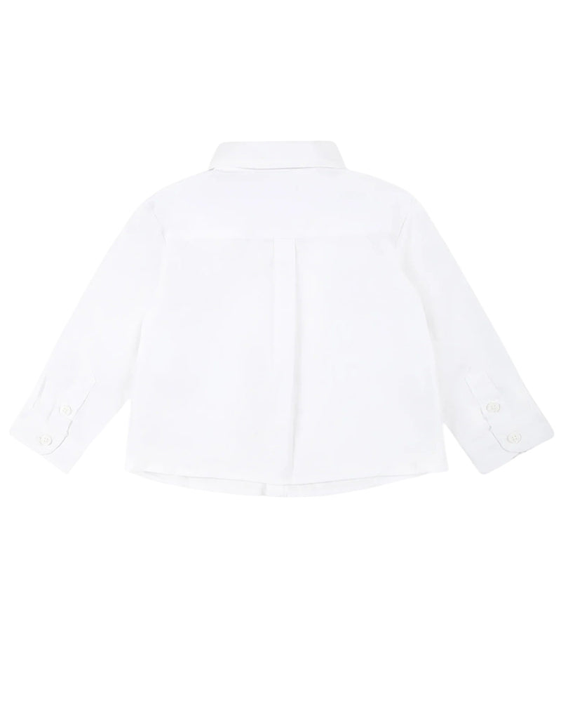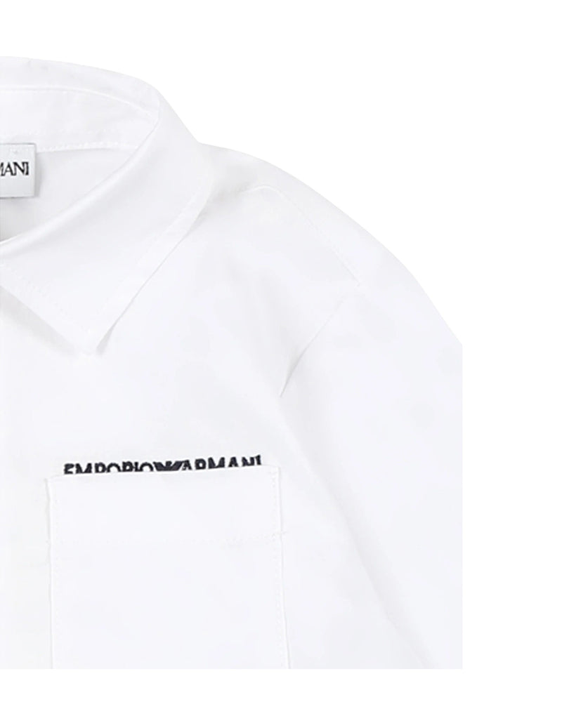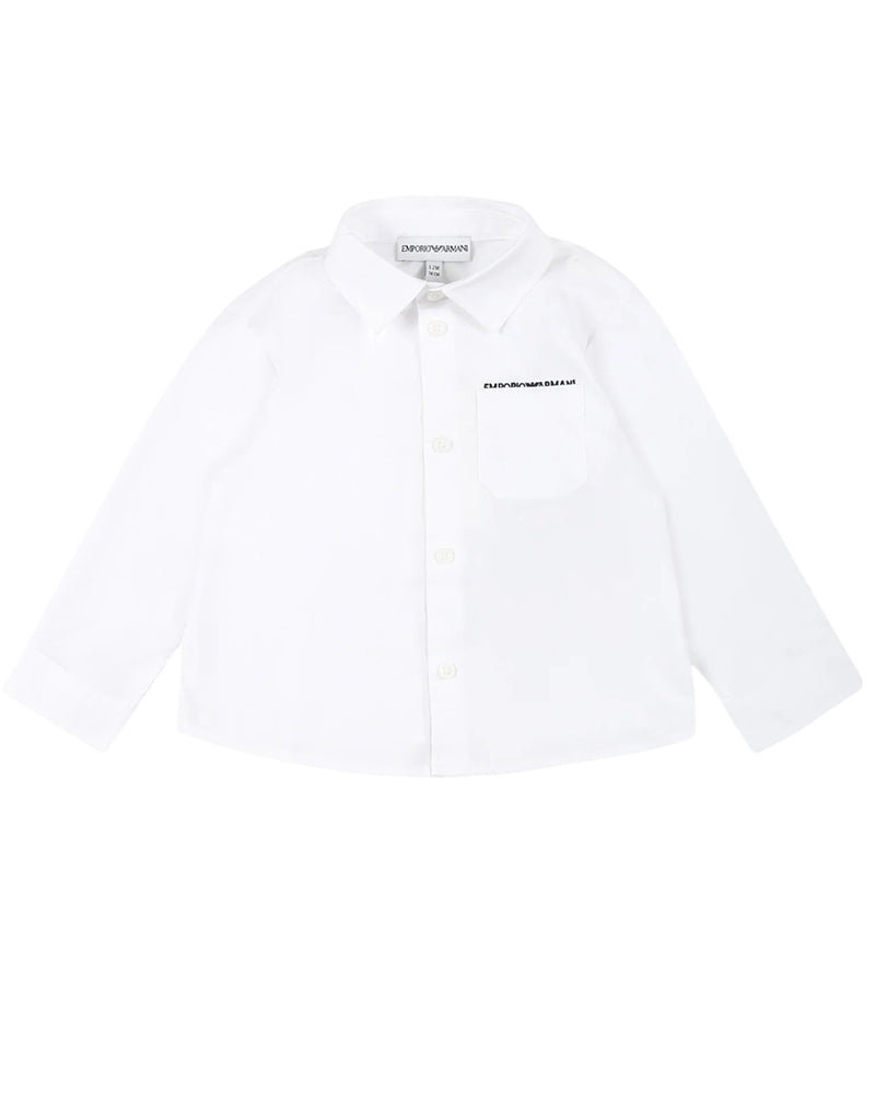 Camicia bianca da neonato realizzata in popeline di cotone. Presenta colletto a punta, chiusura frontale con bottoni e maniche lunghe. È decorata con taschino applicato sul petto e logo ricamato.