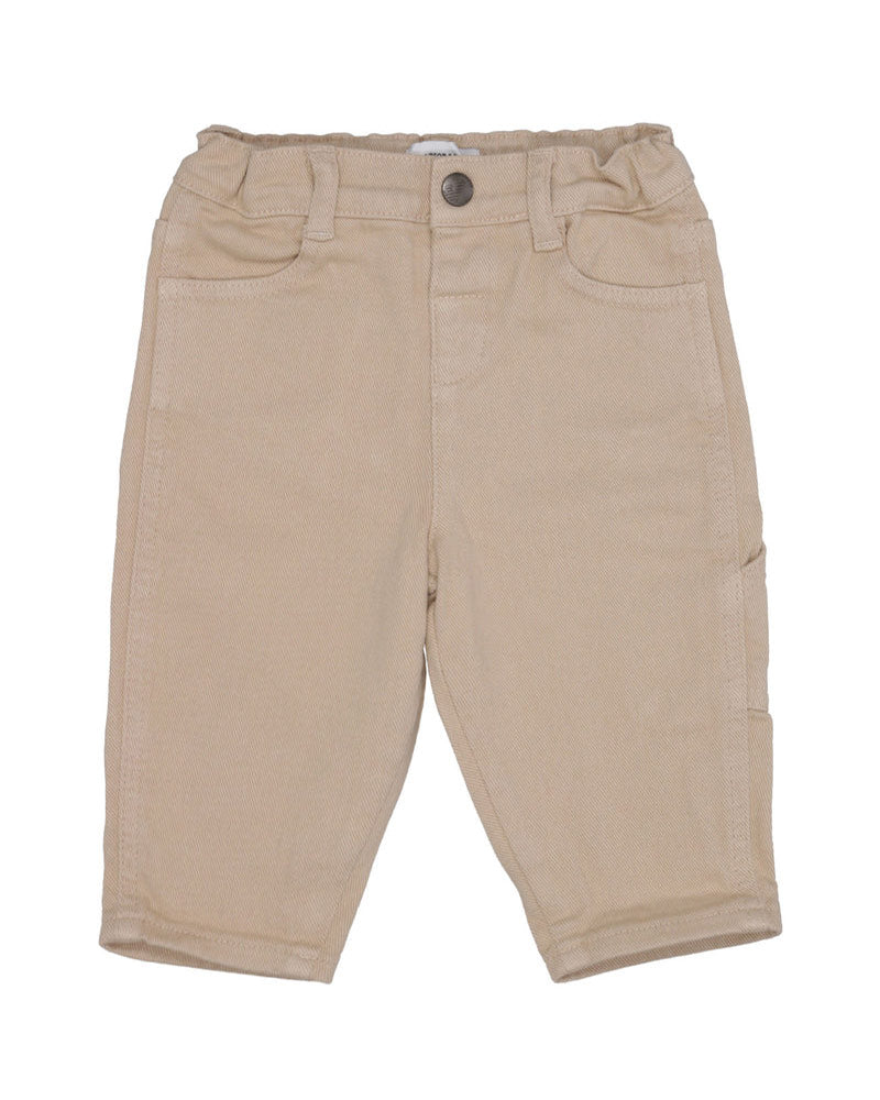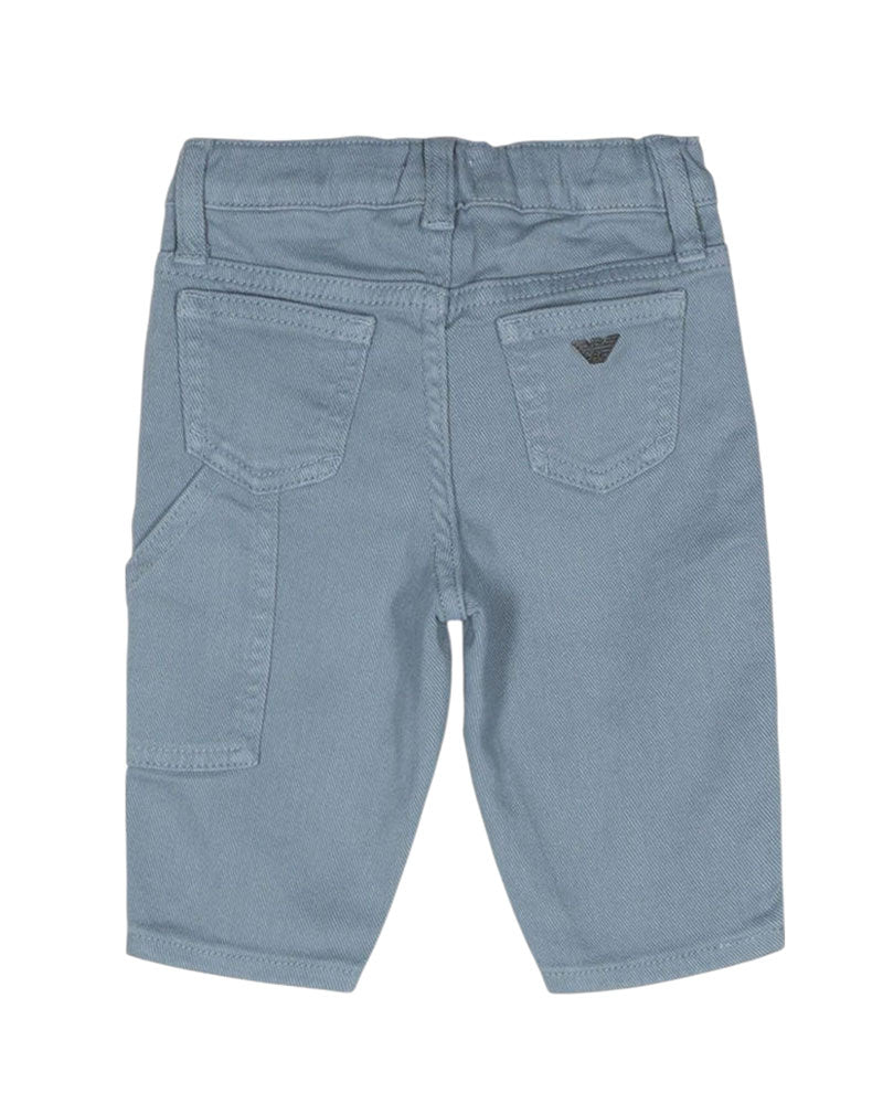 Pantaloni realizzati in denim di cotone, modello cinque tasche. Presentano chiusura frontale con bottoncino a pressione, vita regolabile grazie ad elastico interno con bottoni, passanti per cintura. Sono decorati con placca logo applicata sul retro.