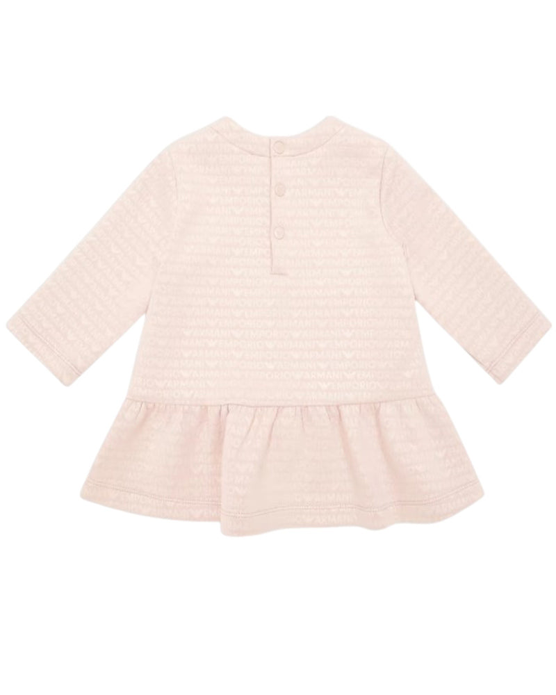 Vestina rosa da neonata realizzata in jersey di misto cotone. Presenta colletto tondo, maniche lunghe, due tasche applicate sul davanti, chiusura con bottoncini a pressione sul retro e gonna a balze. È decorata con stampa logo all-over.