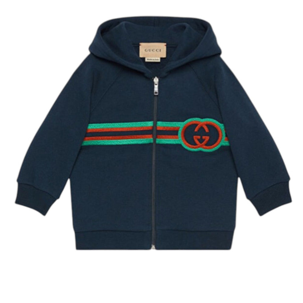 Felpa realizzata in cotone sgarzato, caratterizzata da cappuccio, chiusura frontale con zip, maniche lunghe, polsi e orlo a costine. È decorata con ricamo con Incrocio GG e motivo Web Gucci.