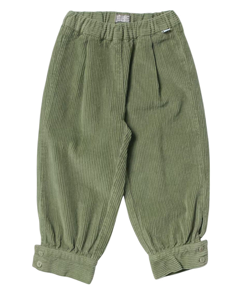 Pantaloni realizzati in velluto a coste, caratterizzati da vita elasticizzata, gamba ampia e orlo con bottoncini.