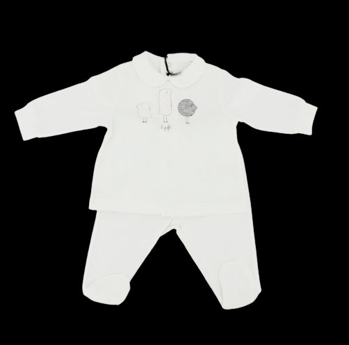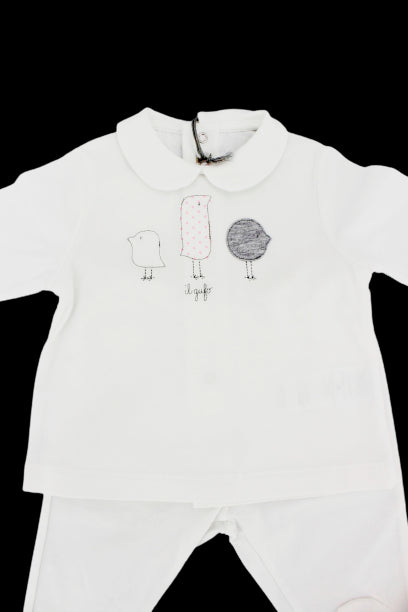 Zweiteiliger Il Gufo-Einteiler mit aufgenähten süßen kleinen Vögeln auf der Vorderseite.