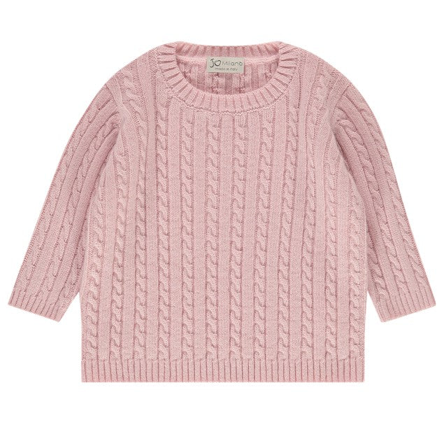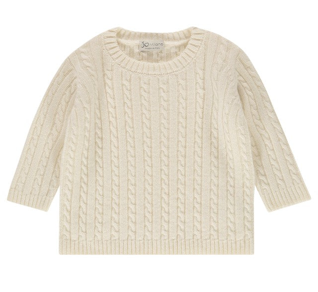 Langärmliger Wollpullover mit Rundhalsausschnitt, Zopfmuster und gerippten Abschlüssen.