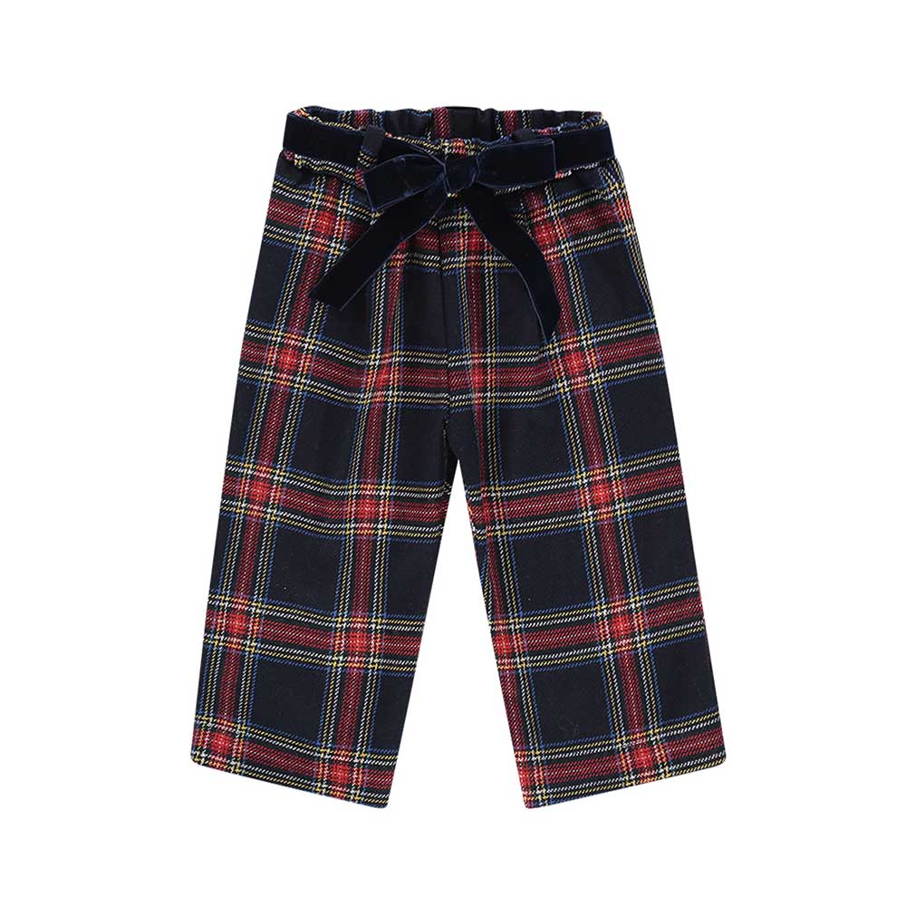 Pantaloni realizzati in misto lana da neonata, caratterizzati da fantasia tartan, vita elasticizzata e cinturino in velluto.