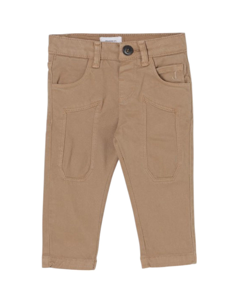 Pantaloni da neonato realizzati in gabardina di cotone. Modello cinque tasche. Presentano chiusura frontale con bottone, vita regolabile grazie ad elastico interno con bottoni, passanti per cintura e patch logo applicato sul retro.