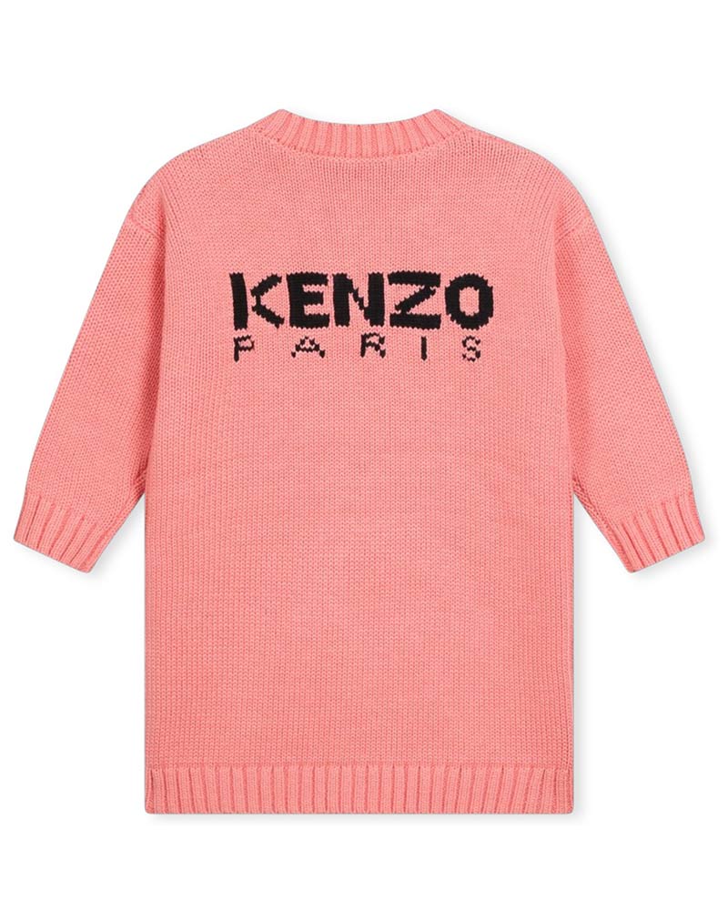 Vestina rosa da neonata realizzata in filato di cotone. Presenta colletto tondo, maniche lunghe, chiusura con bottoncini sulla spalla e finiture a coste. È decorata con motivo fiore ad intarsio sulla parte anteriore e logo sulla parte posteriore.
