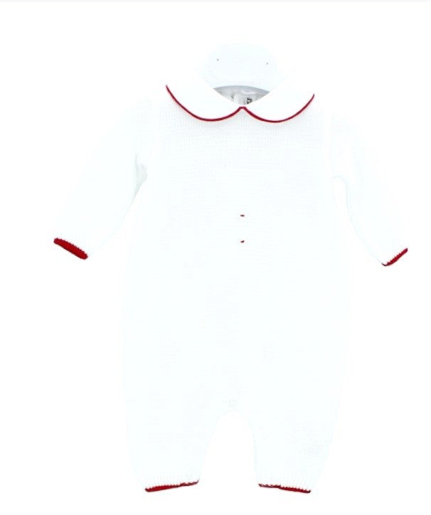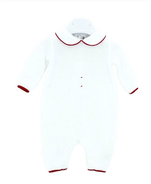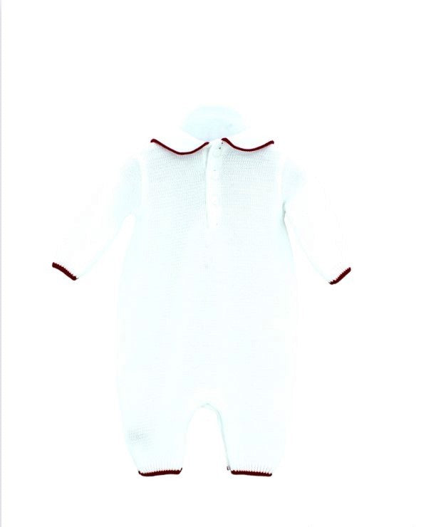 Einteiler „Little Bear“ aus weißem Garn mit fuchsiafarbenen Details.