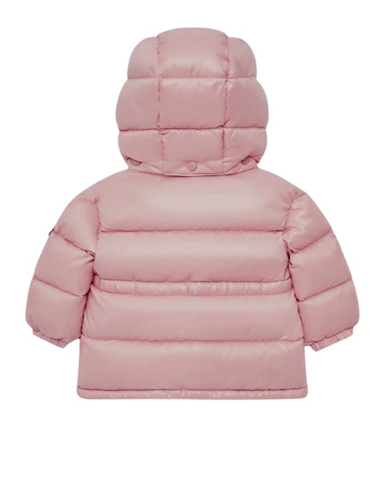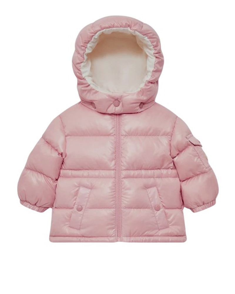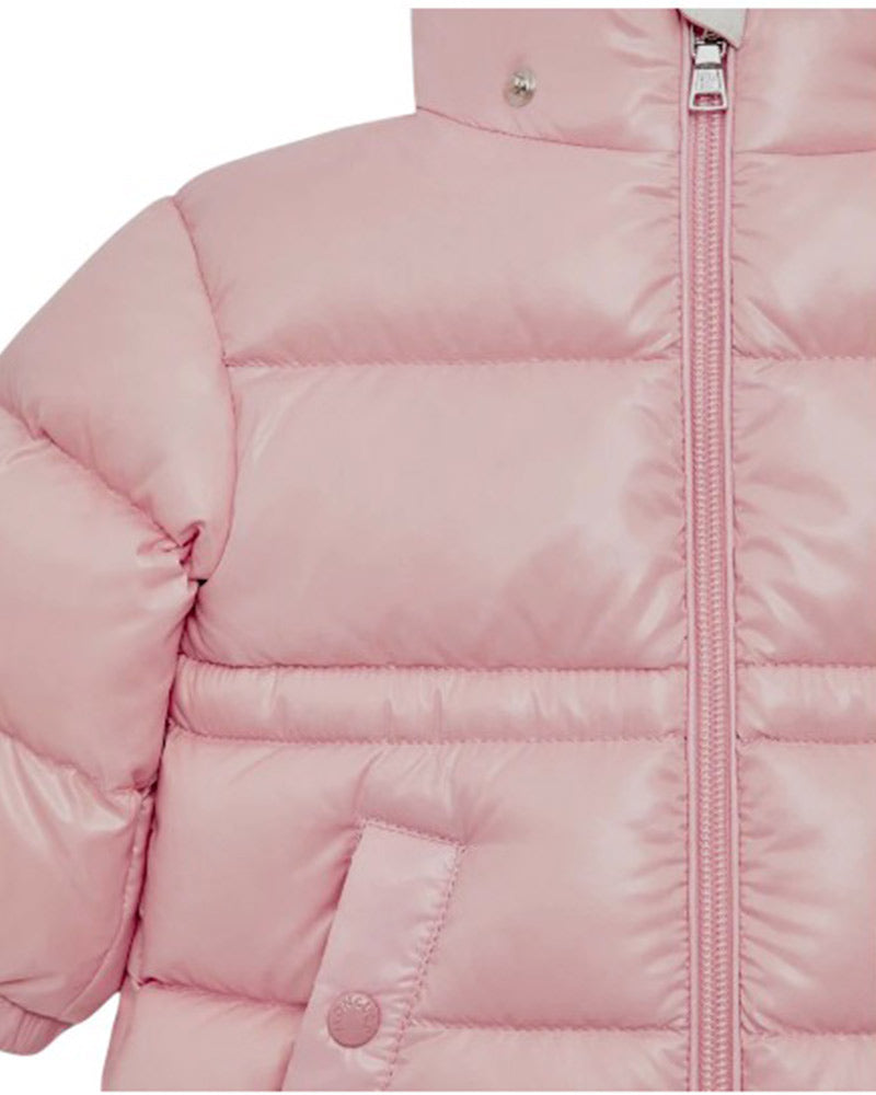 Maire-Daunenjacke aus lackiertem Nylon, abnehmbare Kapuze, Reißverschluss vorne, elastischer Ärmelabschluss, Logodetails, zwei Seitentaschen mit Knopf, kleine Tasche am Ärmel mit Patte.