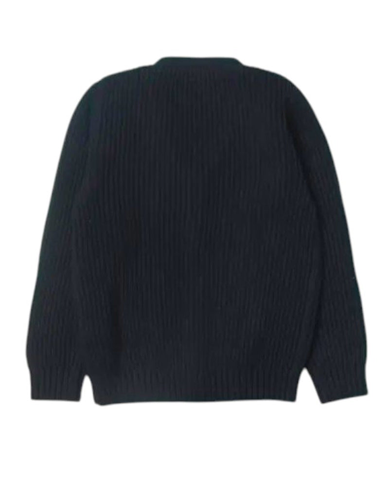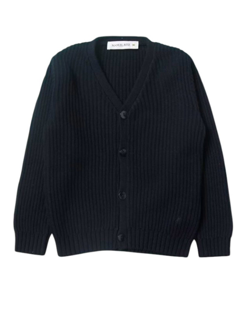 Cardigan blu da bambino realizzato in misto cotone e cashmere. Presenta design a coste, scollo a V, chiusura frontale con bottoni, maniche lunghe e finiture a costine.