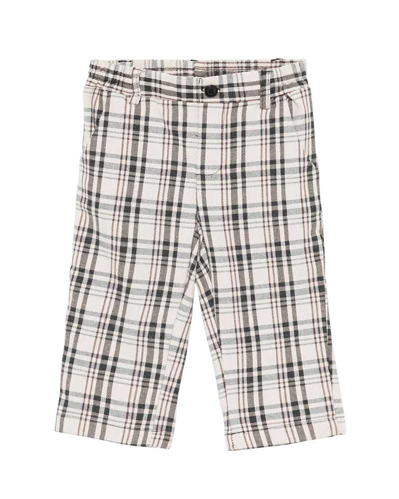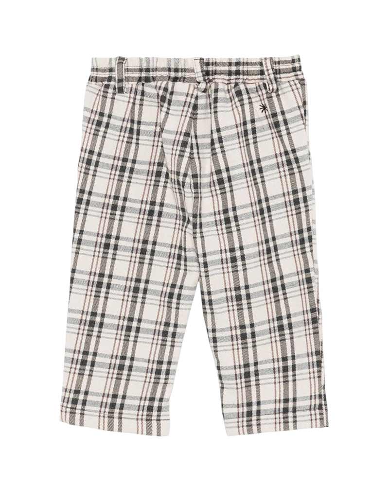Pantaloni a quadri da neonato realizzati in misto cotone, sono caratterizzati da vita elasticizzata con bottoncino decorativo, passanti per la cintura e tasche laterali oblique.