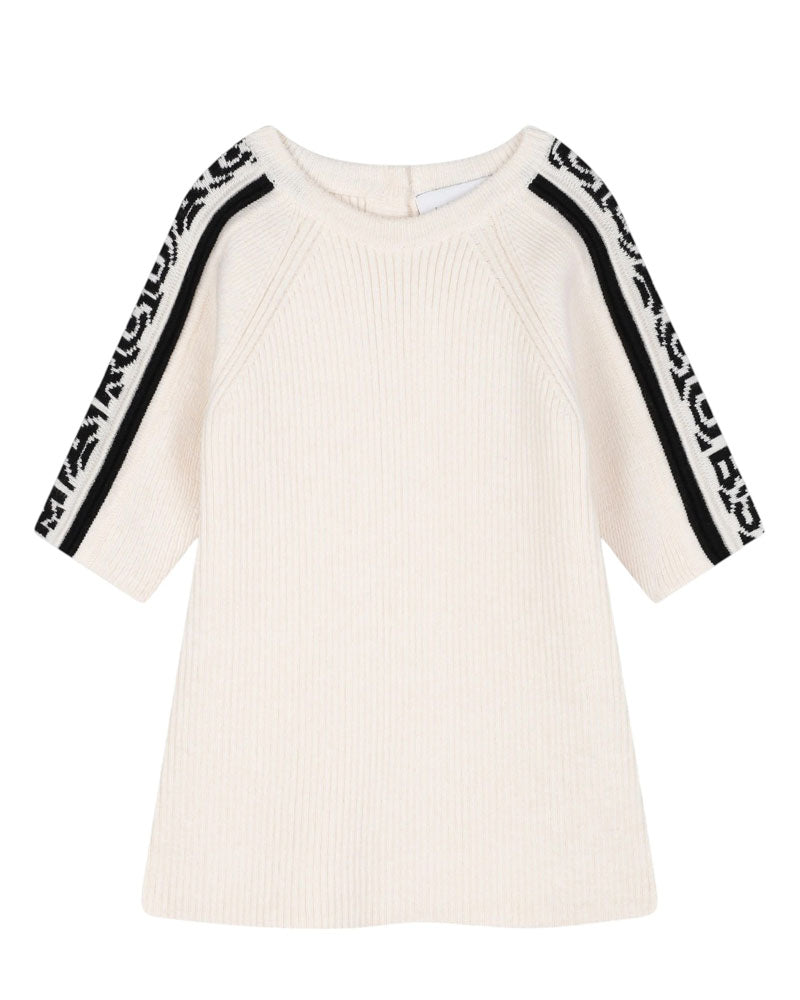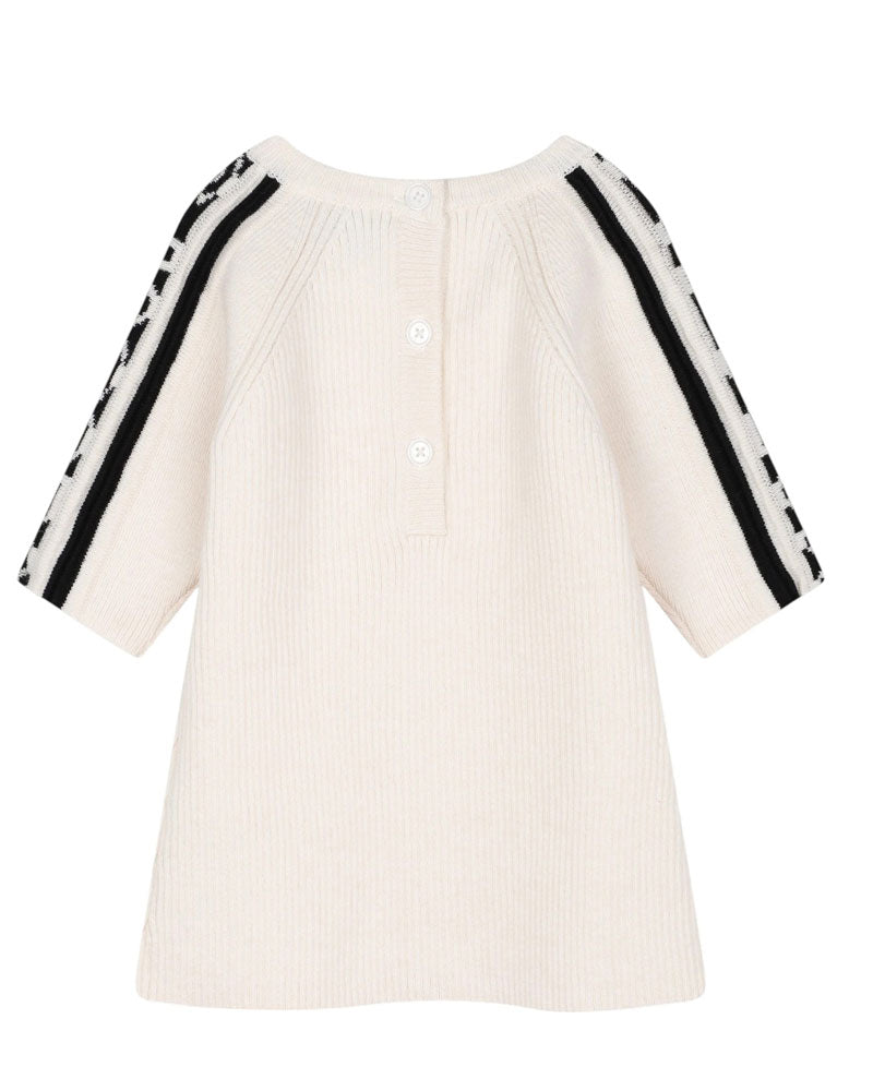 Vestina realizzata in maglia a coste da neonata. Presenta collo rotondo, maniche lunghe con logo jacquard ad intarsio, chiusura con bottoncini sul retro, orlo dritto.
