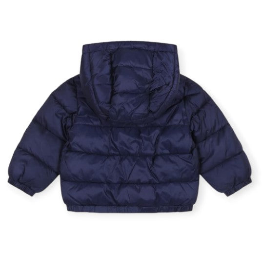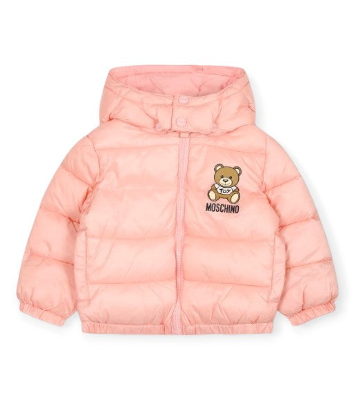 Gesteppte Babyjacke mit abnehmbarer Kapuze, Reißverschluss vorne, seitlichen Leistentaschen, Teddy-Print und Logo auf der Brust.