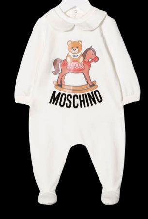 Moschino-Strampler mit Teddy auf dem Schaukelpferd.