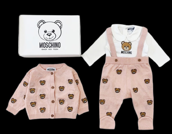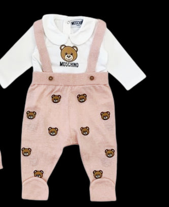Moschino Body-Saloupette-Cardigan-Set. Das Set besteht aus Einteiler, Body und Strickjacke.
