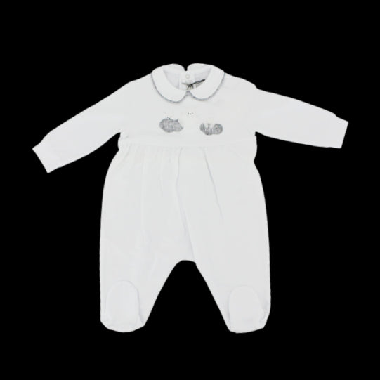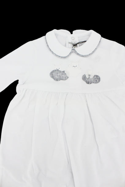 Il Gufo-Strampler mit 3 aufgenähten Wolken auf der Vorderseite.