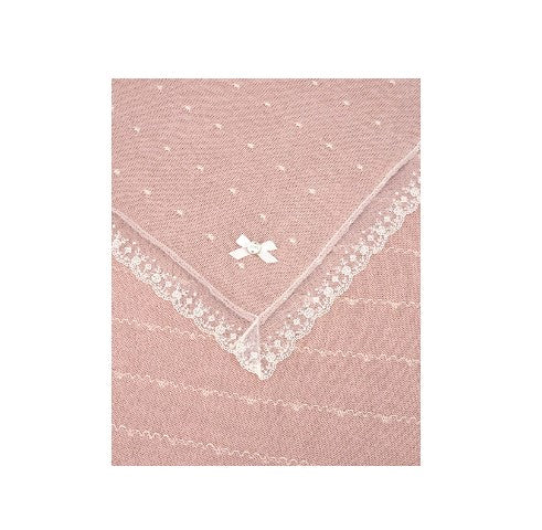 Gestrickte Decke aus Baumwolle und Kaschmir mit einem bezaubernden kontrastierenden Polka-Dot-Design. Abgerundet mit einer breiten bestickten Rüsche und Wellen. Detail eines Perlmutttellers mit Samtschleife. Mit den Maßen 105 x 105 cm bietet es maximalen Komfort und Wärme, um das Baby ab den ersten Lebenstagen einzuwickeln oder in den Armen zu tragen.