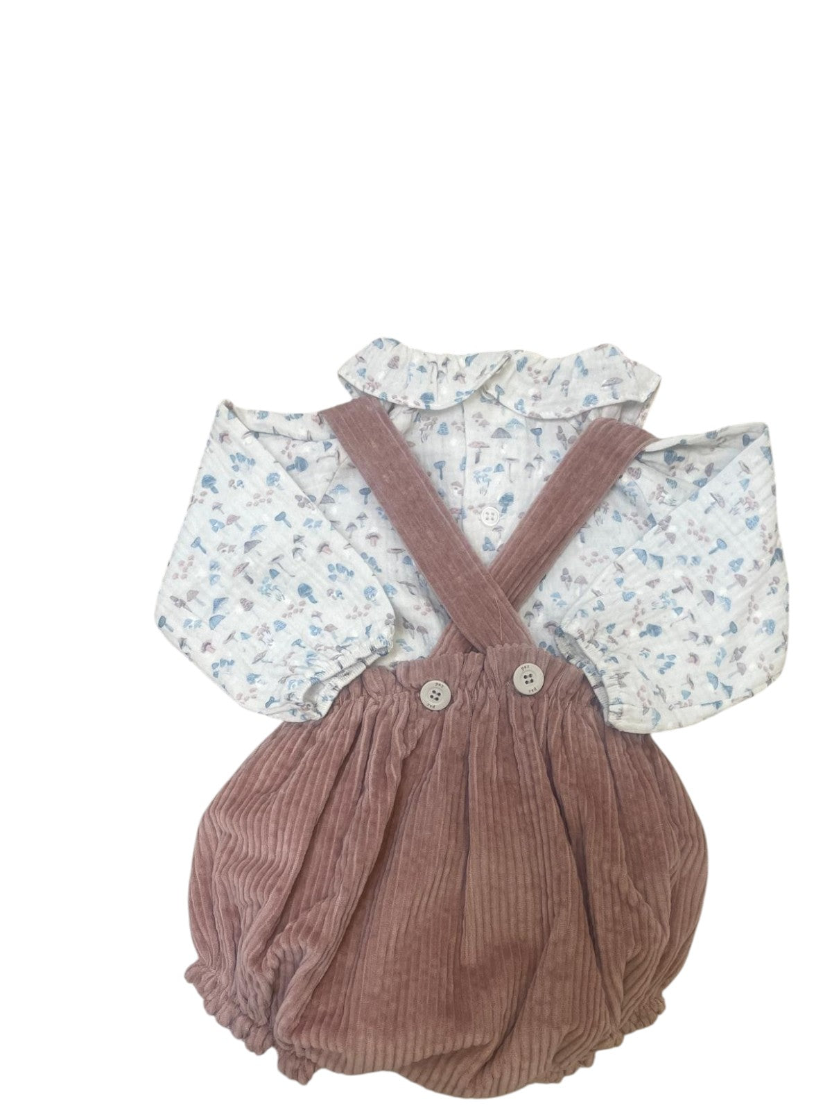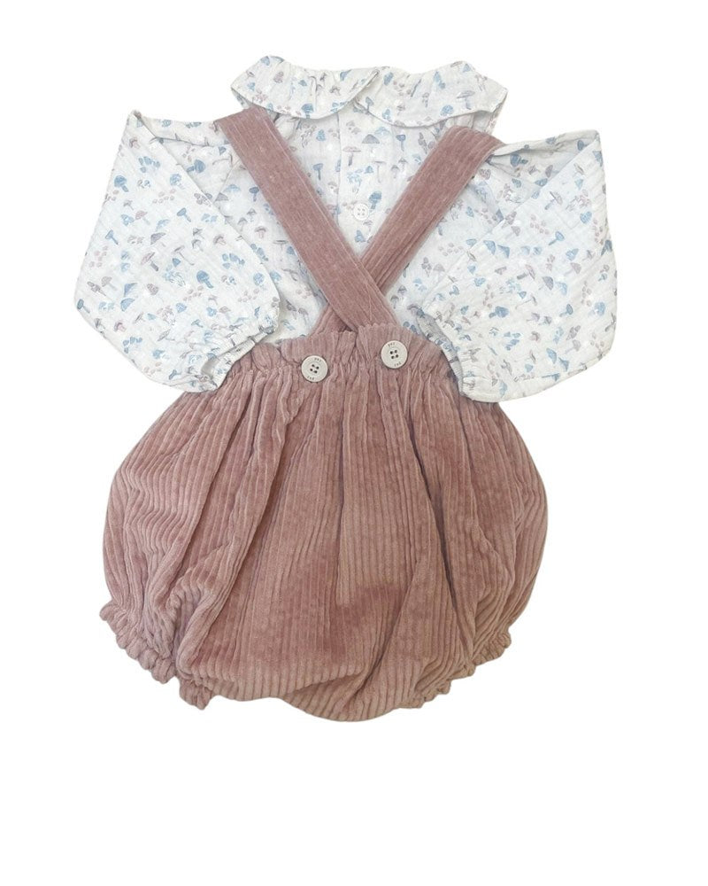 Paz Rodríguez con blusa in cotone fantasia funghetti e salopette in velluto rosa antico a coste. Bretelle incrociate e bottoncini in vita. Delicato e perfetto per l’autunno/inverno.