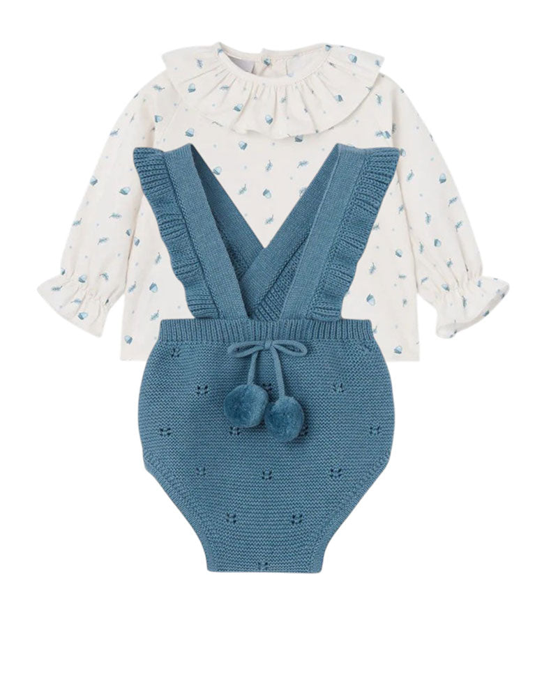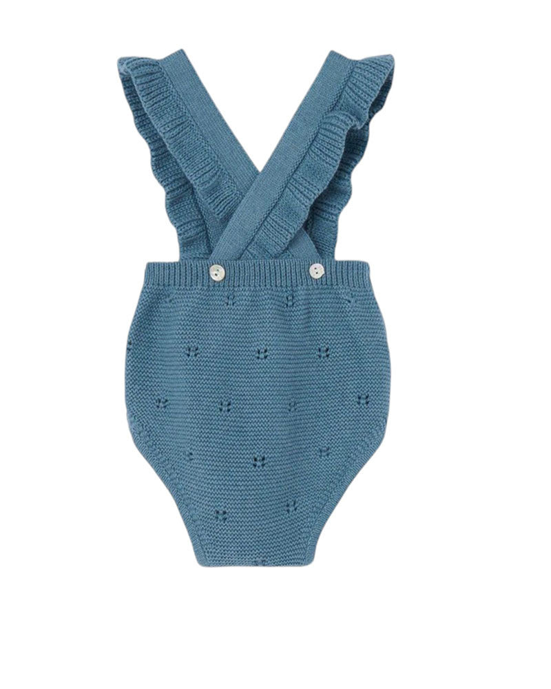 Culotte in maglia con bretelle incrociate, volant e fiocco decorativo con pompon. Il motivo traforato dona un tocco delicato e speciale