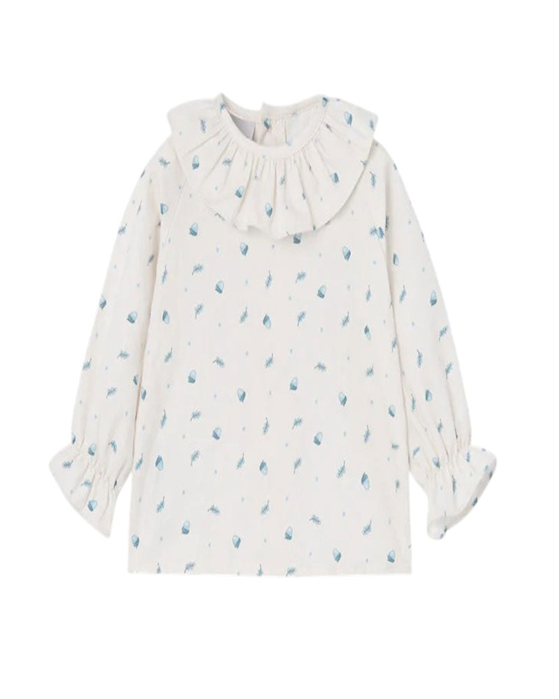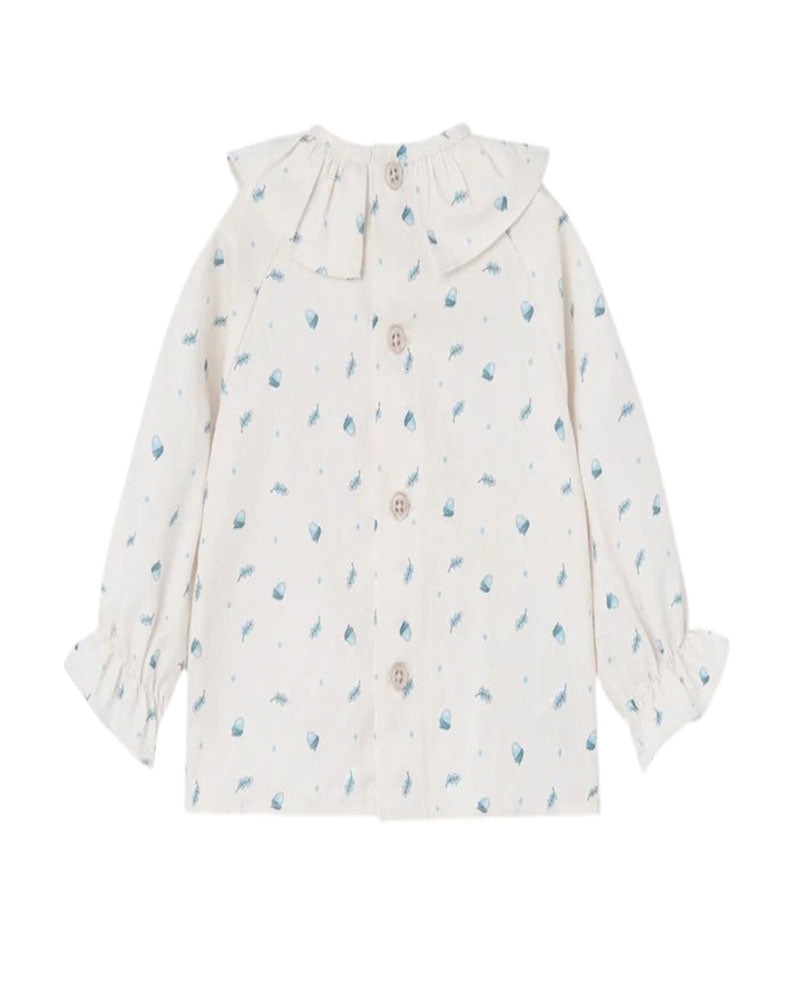 Camicia in cotone stampato con motivo QUINTA. Colletto bebè, maniche lunghe e chiusura posteriore con botton abbinata alla
