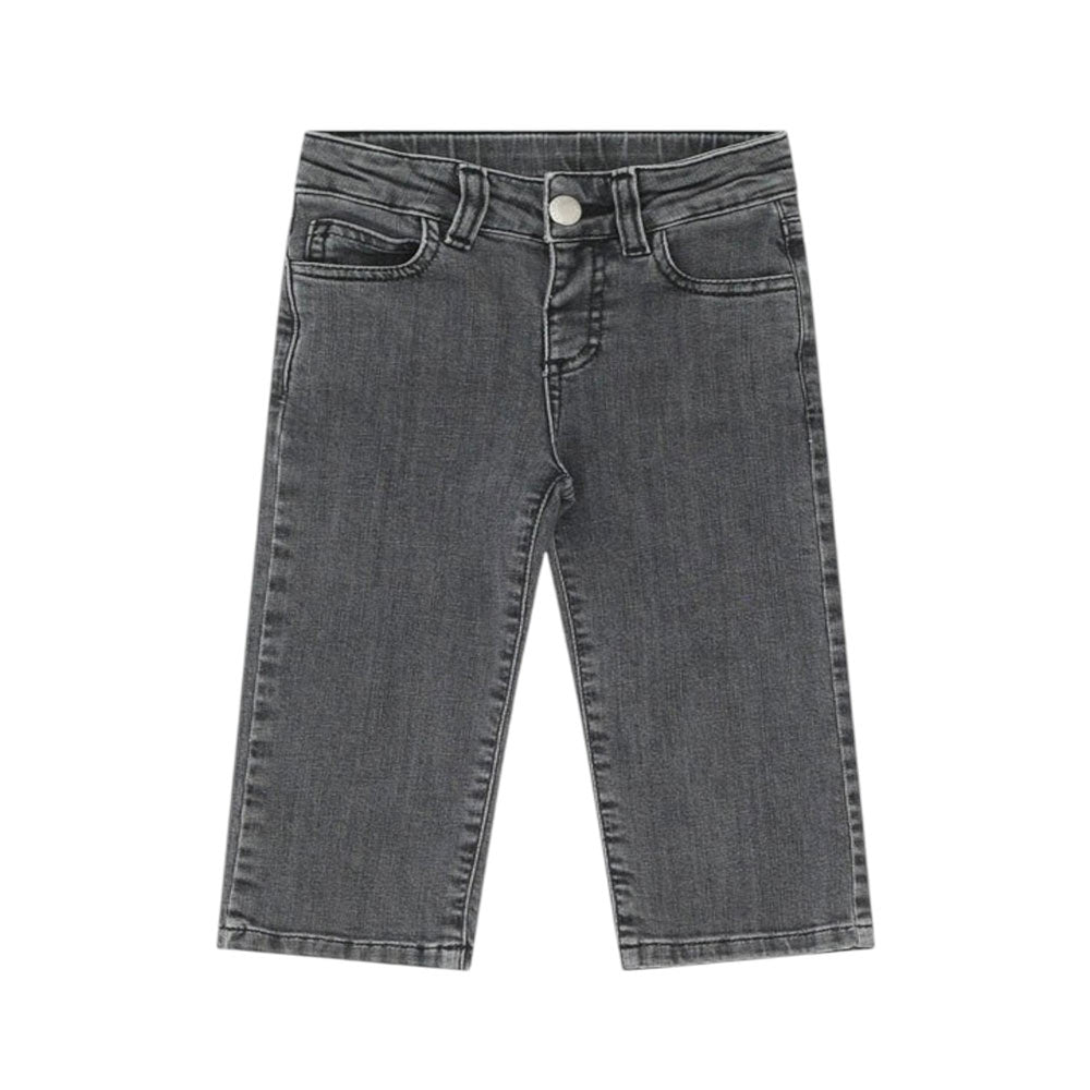 Jeans Straight Leg realizzati in denim grigio. Modello cinque tasche. Chiusura frontale con bottone e zip, vita regolabile grazie ad elastico interno con i bottone e passanti per la cintura. Sono decorati con placca logo in metallo applicata sul retro.