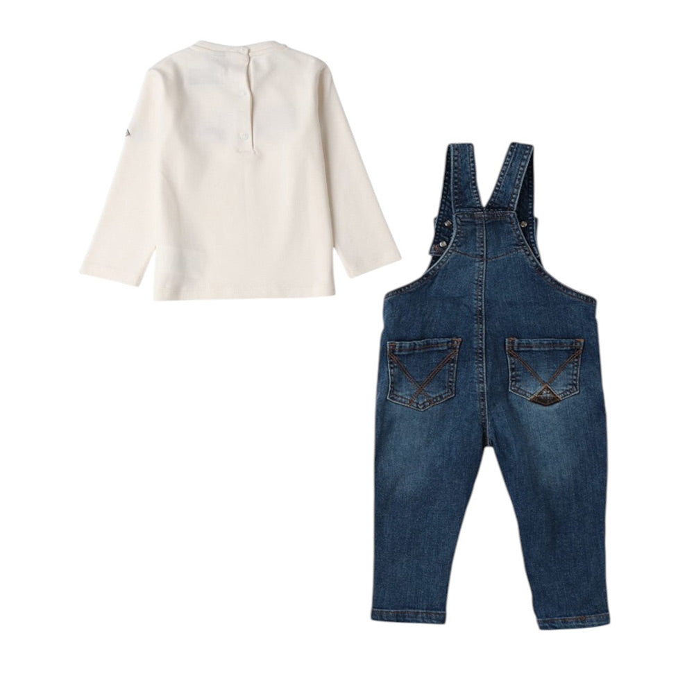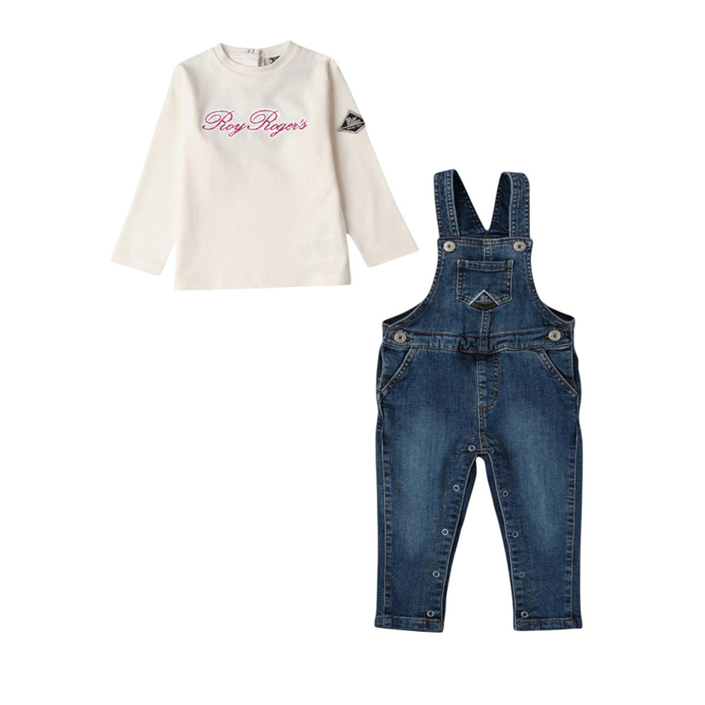 Completo due pezzi composto da salopette realizzata in denim di cotone stretch, con spalline regolabili, due tasche laterali all'americana, un taschino applicato sul davanti con patch logo, due taschine sul retro ed apertura con bottoncini a pressione sulle gambe; T-shirt avorio realizzata in jersey di cotone, caratterizzata da colletto rotondo, maniche lunghe, logo ricamato sul davanti e chiusura posteriore con bottoncini a pressione.