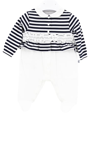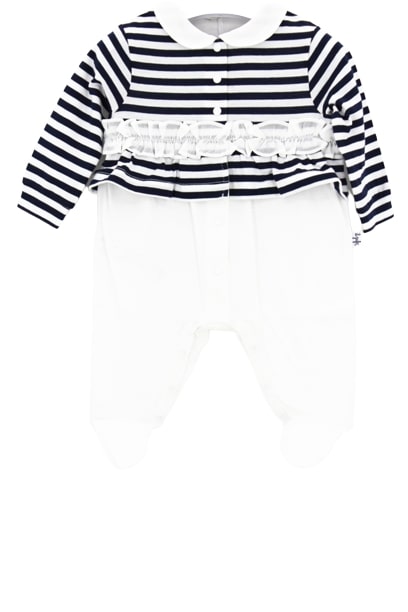 Il Gufo Strampler mit Streifenmuster und Rüschenband.