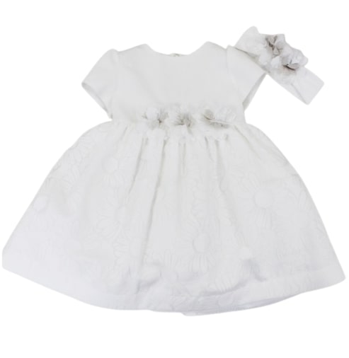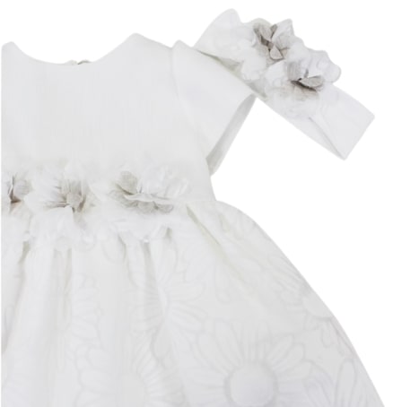 KLEID FÜR NEUGEBORENE MIT BLUMEN AUF DER VORDERSEITE UND DEVORE-DAISY-STOFF, KOMPLETT MIT STIRNBAND