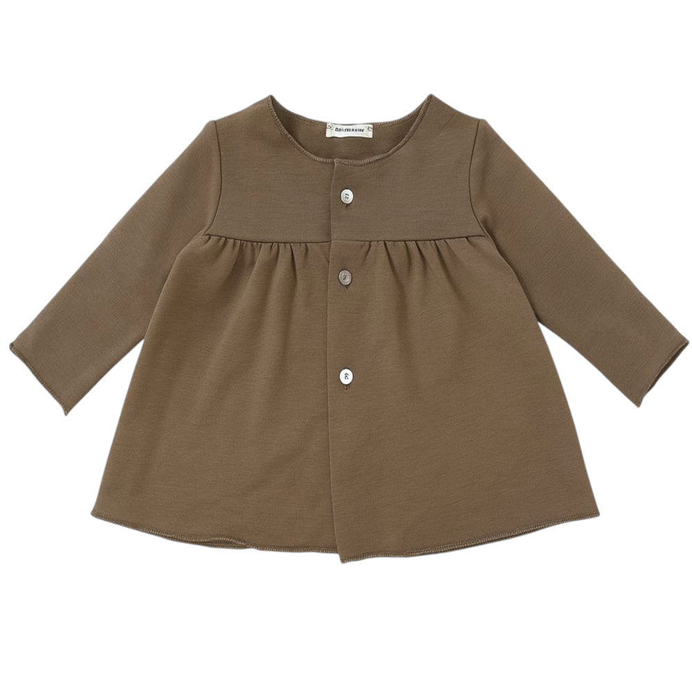 Felpa realizzata in cotone garzato, caratterizzata da colletto rotondo, chiusura frontale con bottoncini, maniche lunghe, orlo svasato e finiture a taglio vivo.