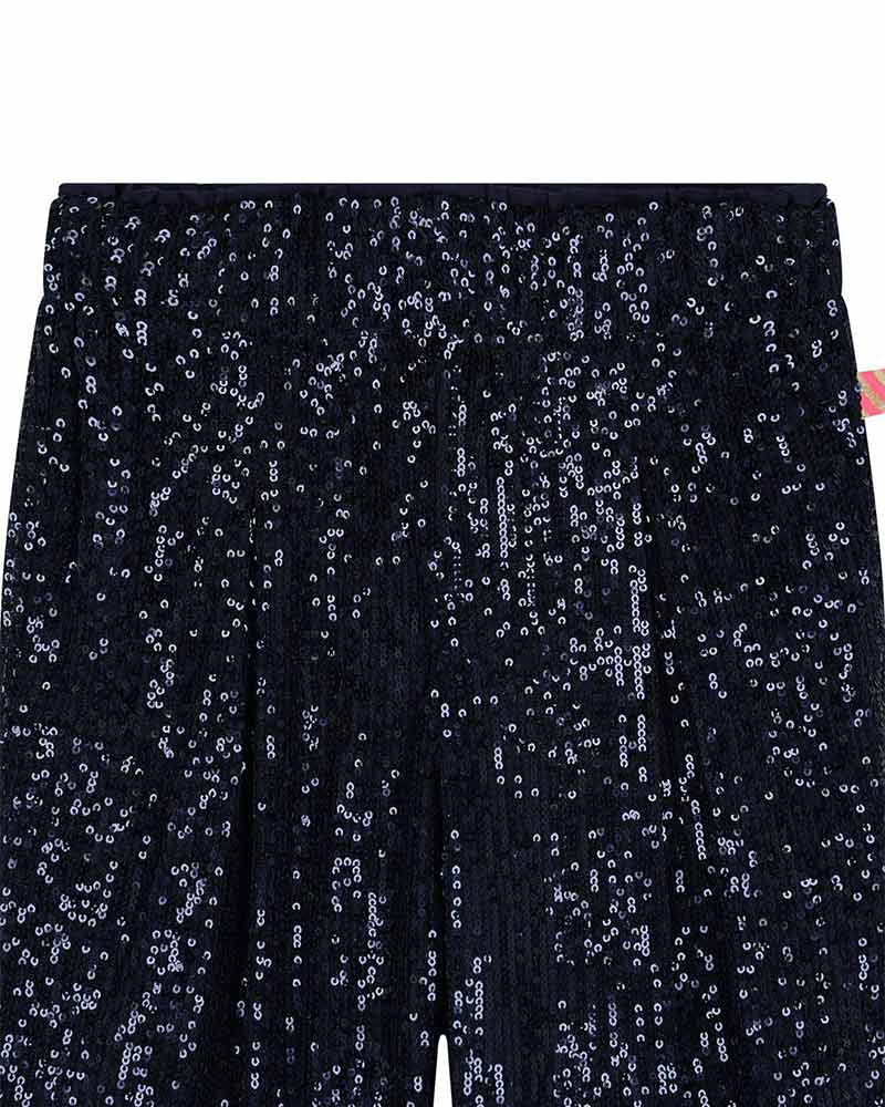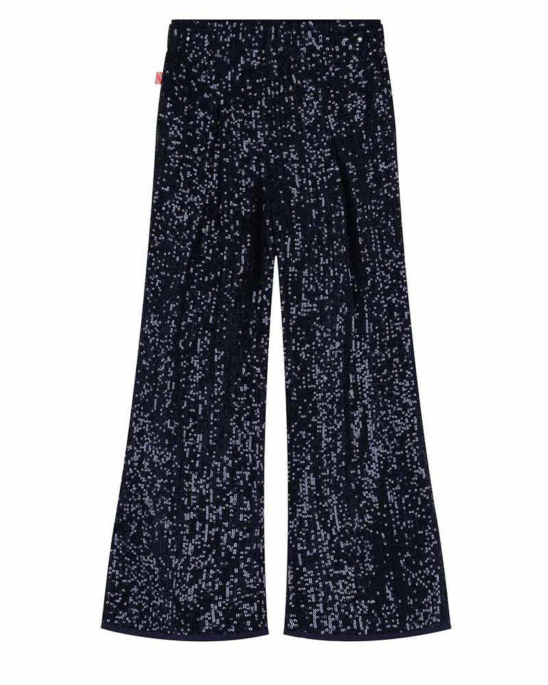 Pantaloni a palazzo blu navy da bambina, realizzati in poliestere setoso e ricoperti di paillettes, hanno un elastico in vita per una vestibilità comoda e sono foderati in morbido jersey di cotone.