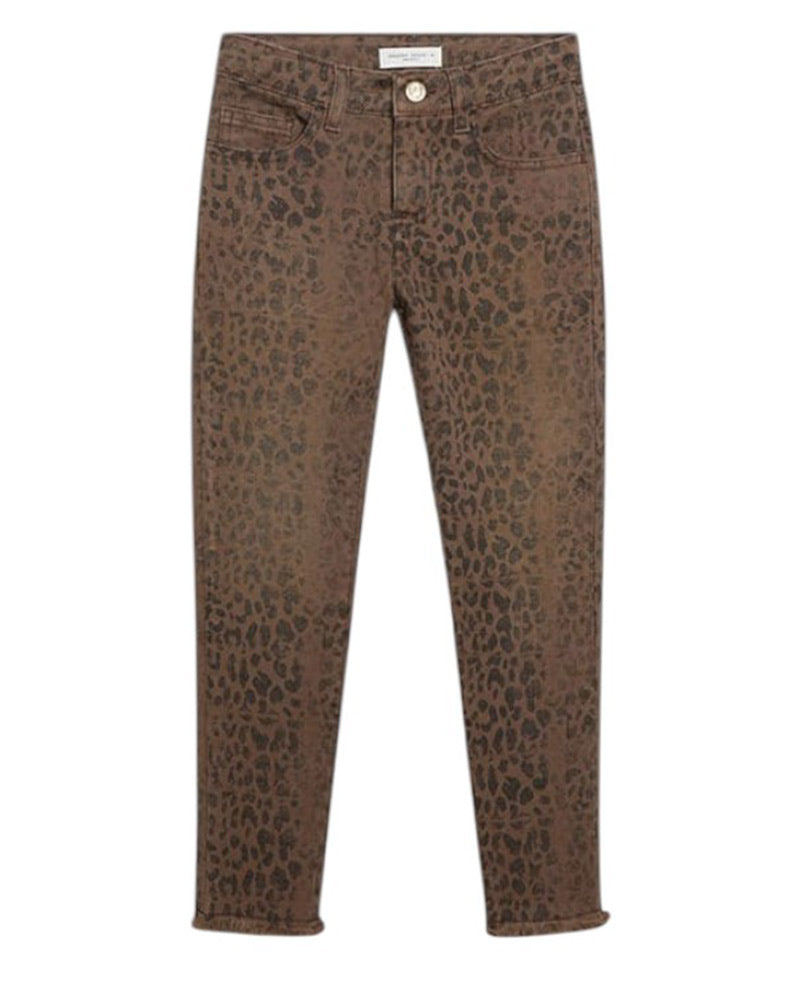Pantaloni da bambina realizzati in denim di cotone, modello cinque tasche. Presentano fantasia animalier all-over, chiusura frontale con bottone e zip, vita regolabile grazie ad elastico interno con bottoni, label logata applicata sul retro e orlo sfrangiato.