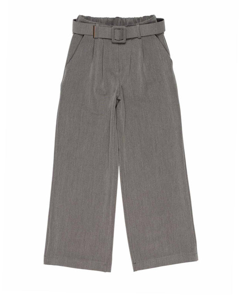 Pantaloni grigi con pince da bambina, caratterizzati da vita elasticizzata con cintura, chiusura frontale con bottone e zip, due tasche laterali all-americana e gamba larga.