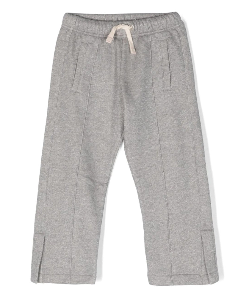 Pantaloni in felpa di cotone effetto mélange, arricchiti da dettagli in lurex. Vita elasticizzata con coulisse, tasche a filetto sul davanti, gamba dritta e fondo con polsini divisi. Logo applicato sul retro.