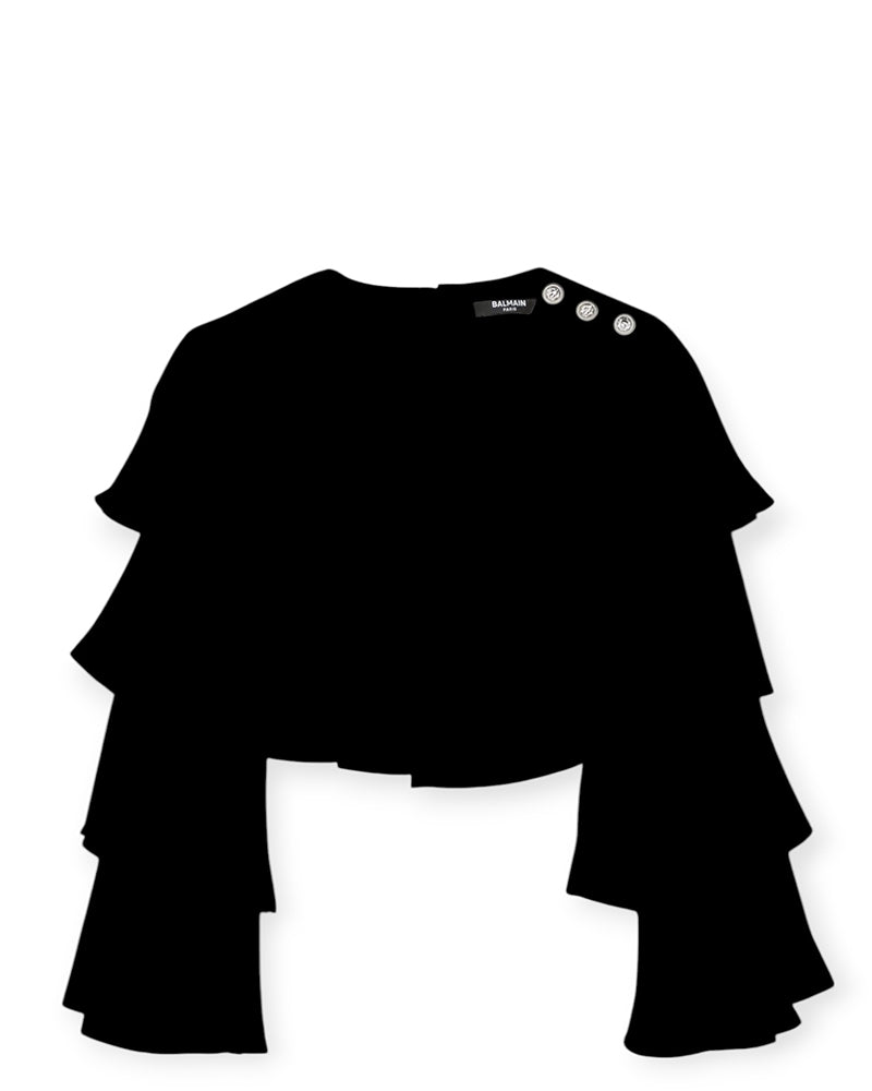 Casacca girocollo con volants, bottoni decorativi sulla spalla, chiusura sul retro, manica con volants.