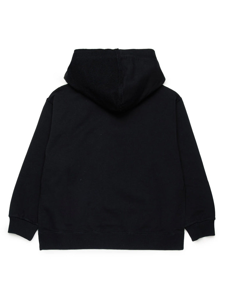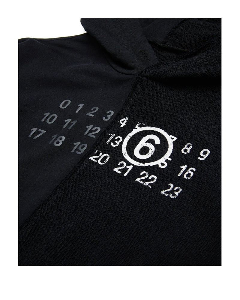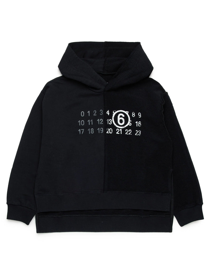 Felpa nera con cappuccio a maniche lunghe. Costruzione re-cut che simula l'assemblaggio di due capi precedentemente destrutturati. Grafica Stamp Numbers sul davanti. Splits laterali. Fondo asimmetrico. Iconica cucitura sul retro. Lavorazione a costine su polsini e fondo.