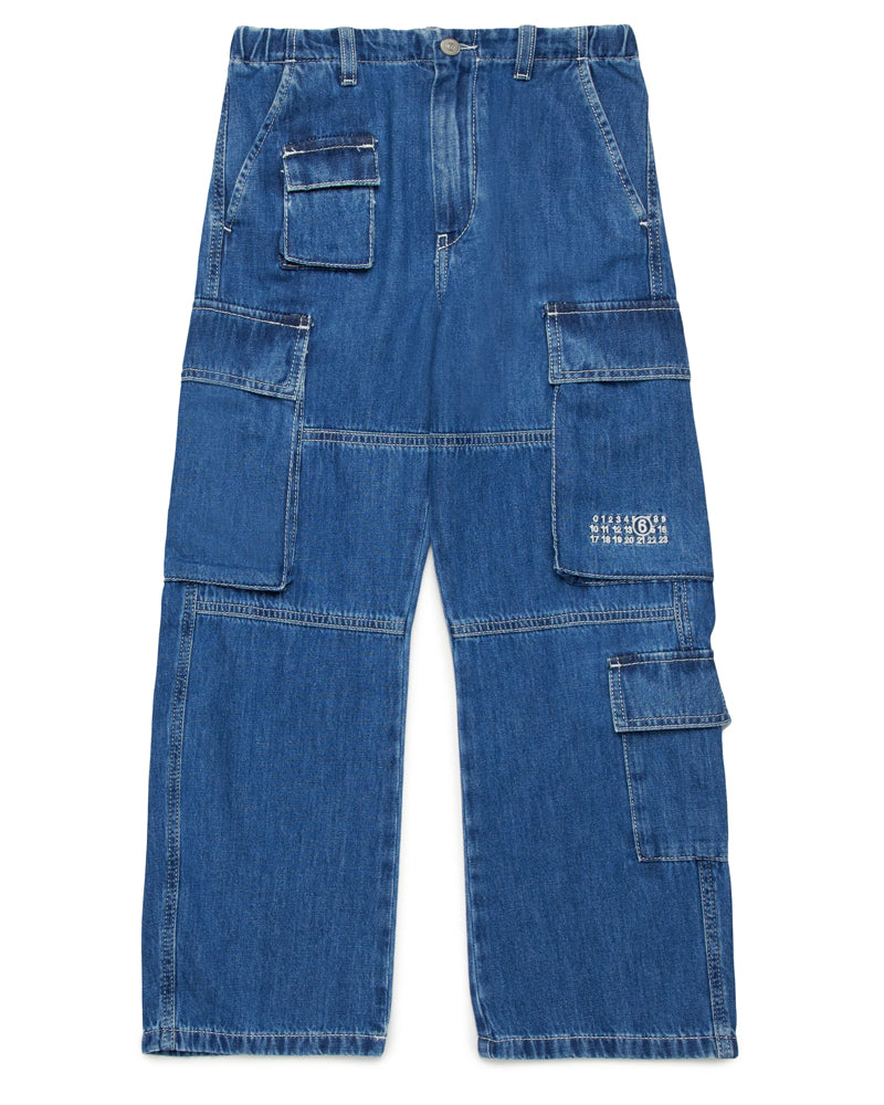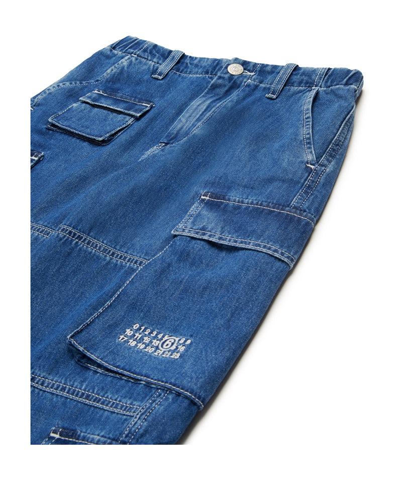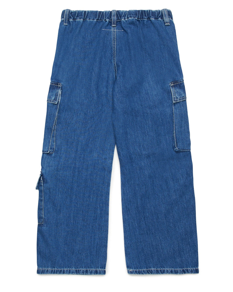 Jeans cargo realizzati in denim di cotone. Presentano chiusura frontale con bottone e zip, vita elasticizzata, due tasche laterali all'americana e tasche cargo applicate lungo le gambe, Sono decorati con numeric logo ricamato sul davanti.