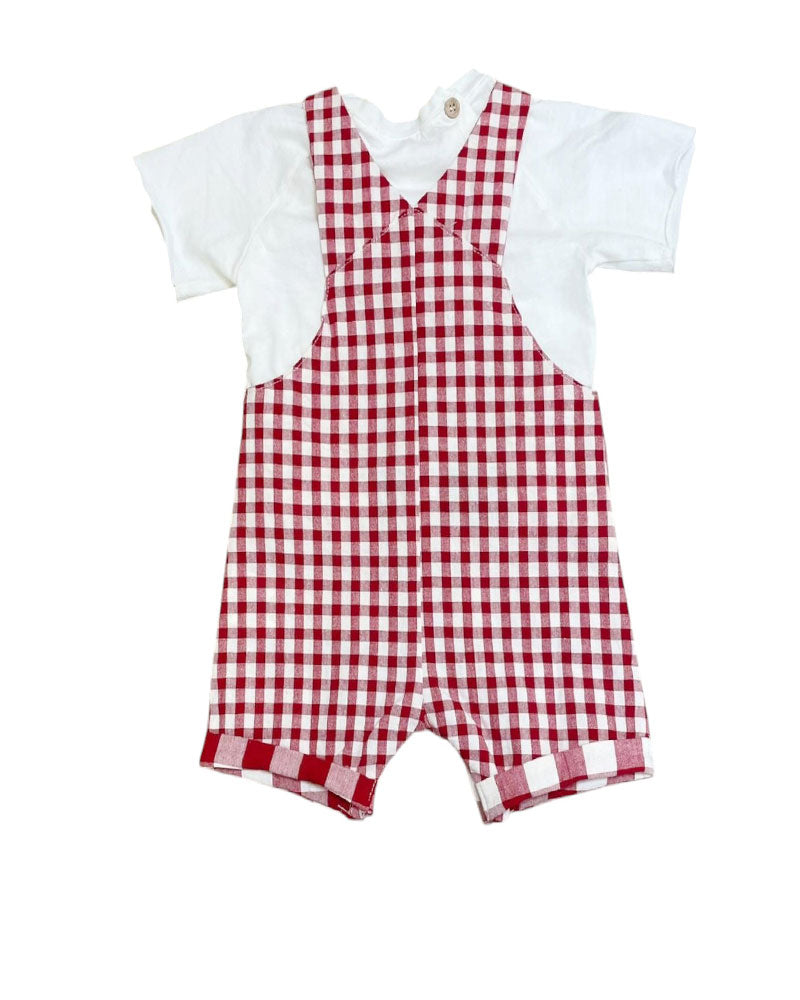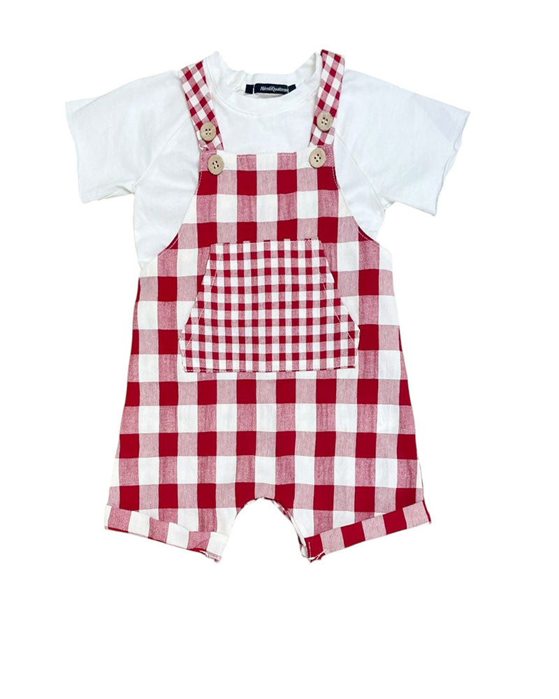 Questa salopette in tela a quadri, caratterizzata da una chiusura con bottoncini in finto legno, unisce stile e praticità. Abbinata alla t-shirt in jersey tinta unita, offre un completo versatile e confortevole, ideale per chi cerca un look raffinato ma funzionale. La qualità dei materiali garantisce durata e comfort durante tutta la giornata.
