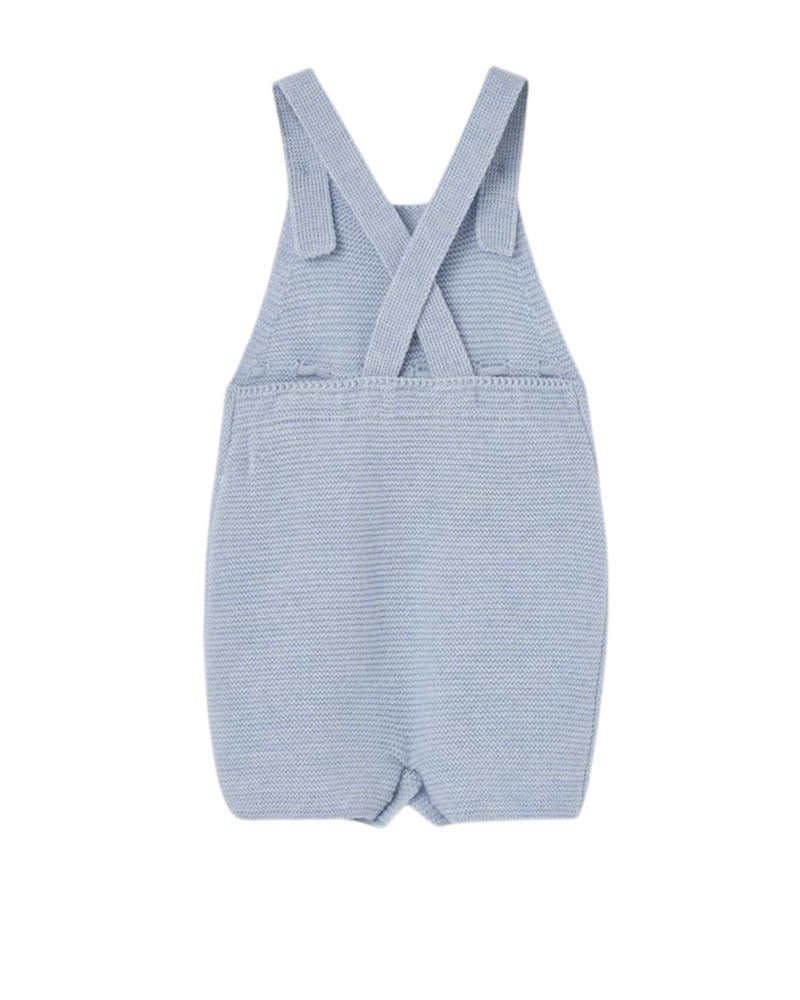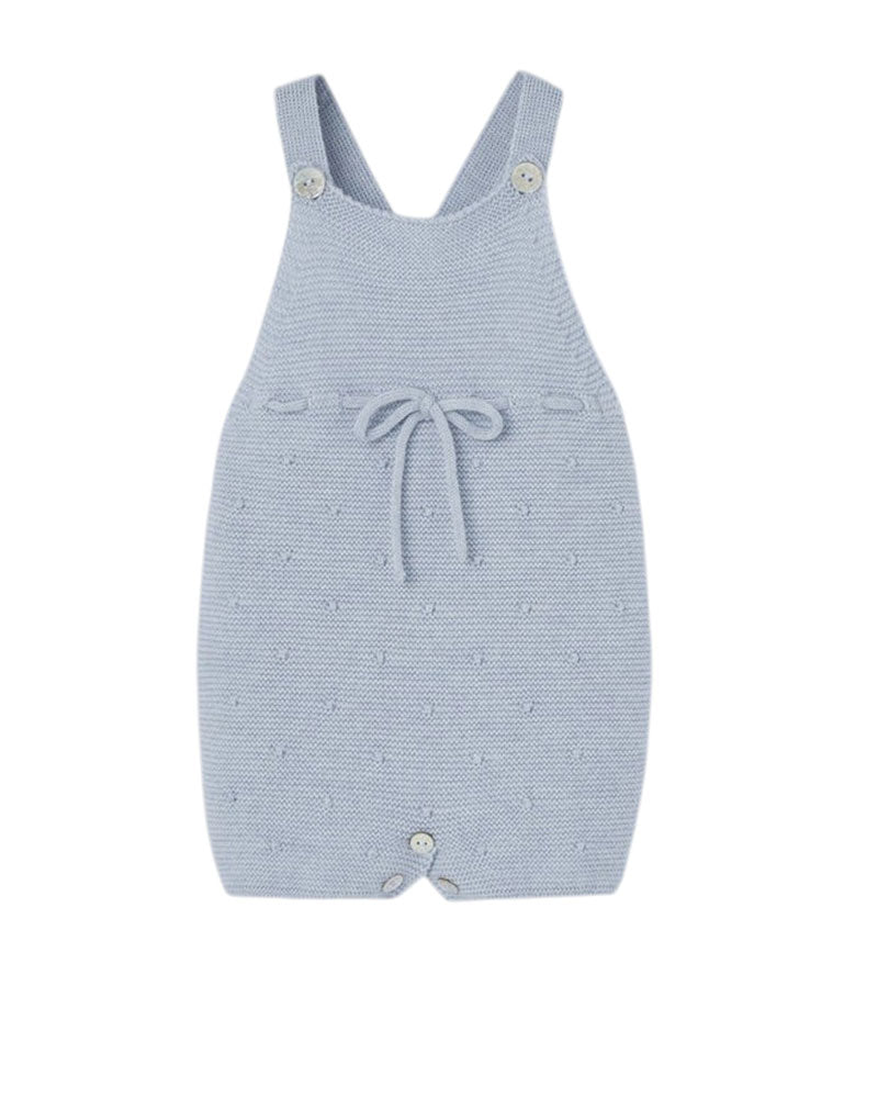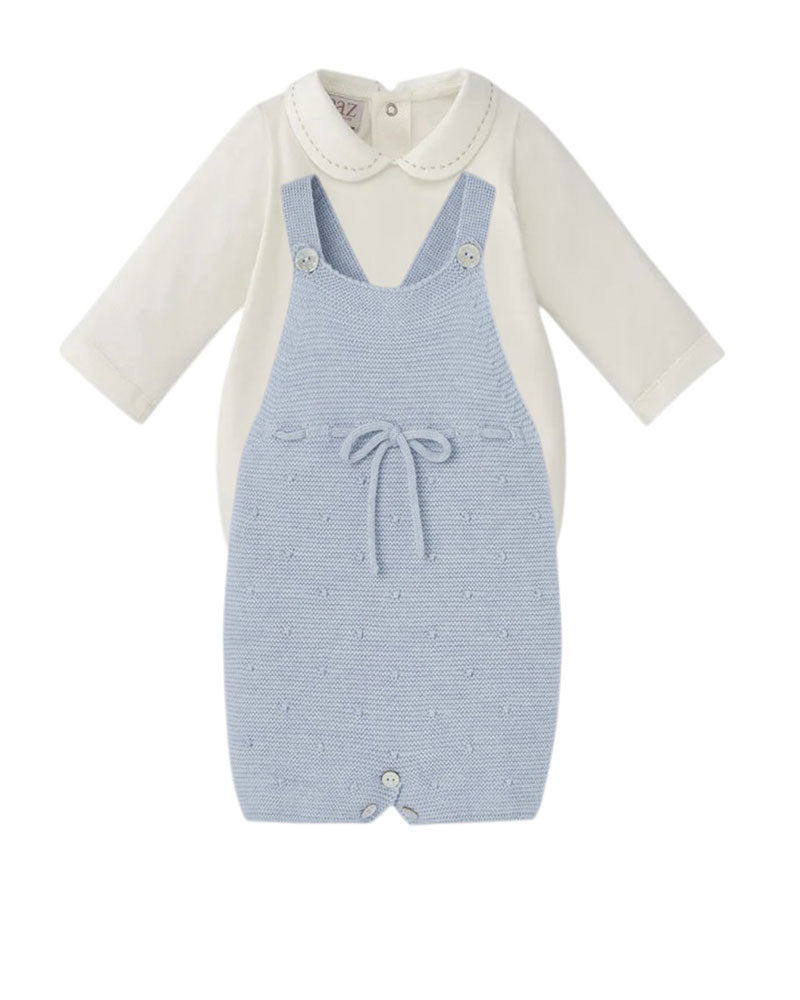 neonato Paz Rodríguez in maglia azzurra, con bretelle a bottoni, fiocchetto decorativo e bottoncini al cavallo abbinato al