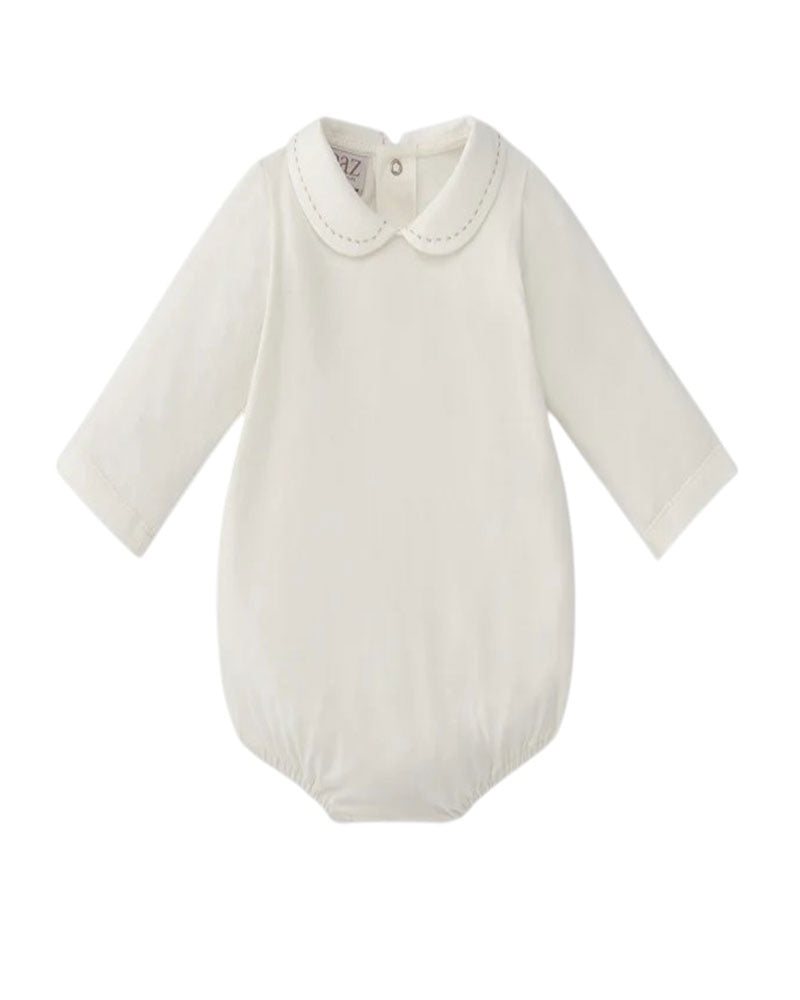 Body in punto circolare a maniche lunghe con colletto ricamato smerlato. Chiusura frontale con bottoni e automatici al cavallo