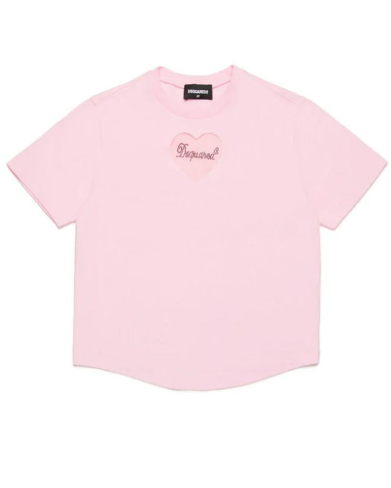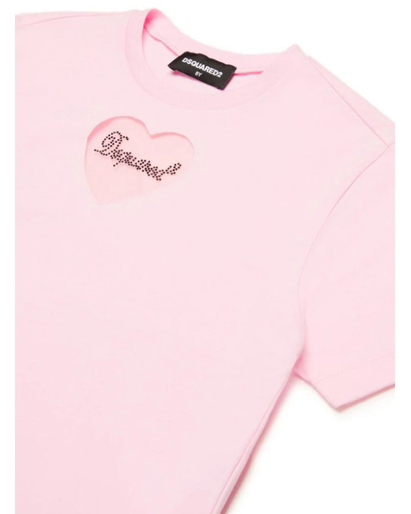 T-shirt rosa da bambina, realizzata in jersey di cotone. Collo tondo, maniche corte, orlo curvo. È decorata con dettagli ritagliati a forma di cuore e abbellimento del logo in strass.