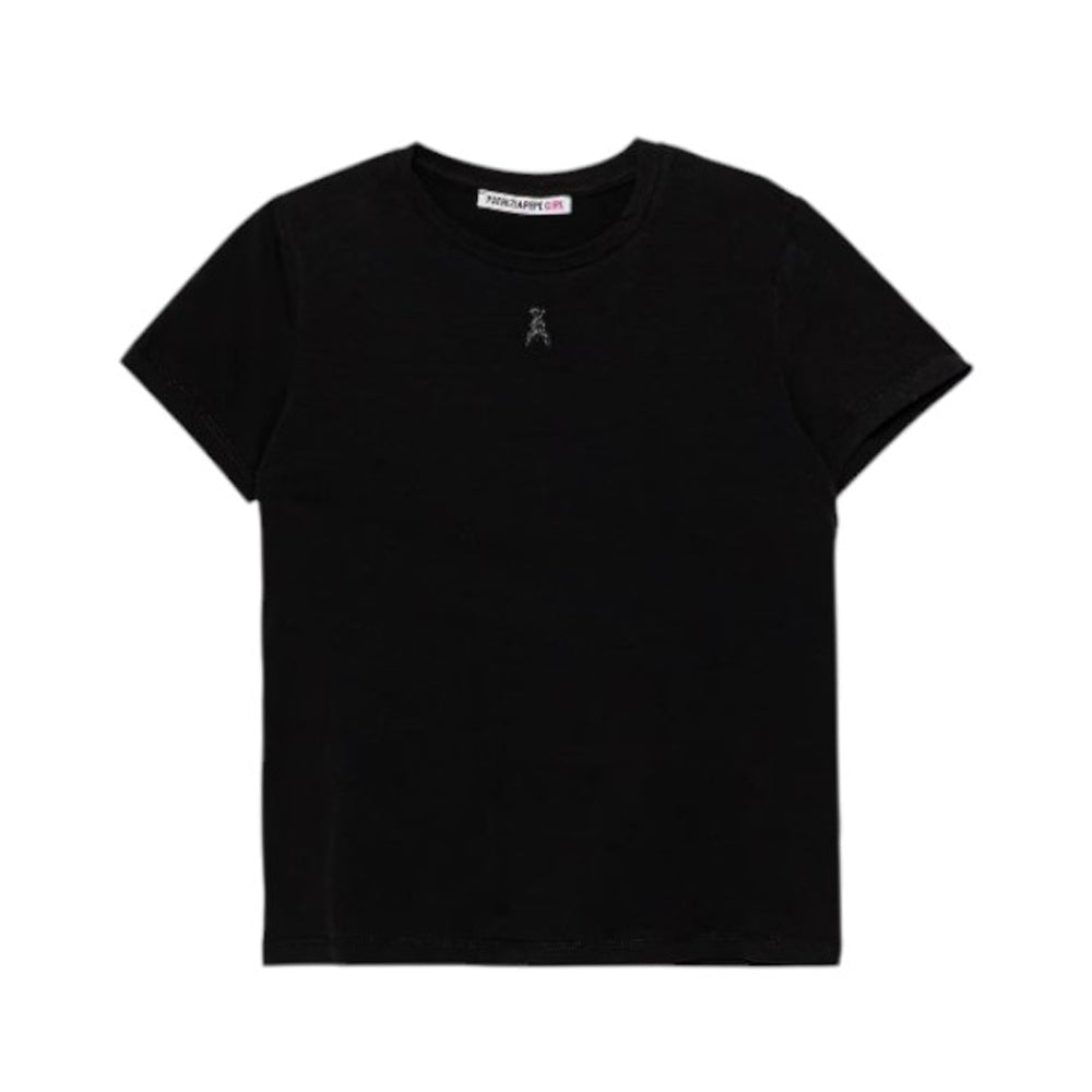 T-shirt realizzata in jersey di cotone, caratterizzata da collo tondo, maniche corte e orlo dritto. È decorata con stampa logo glitterata sul davanti.
